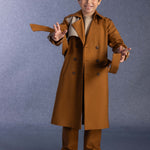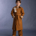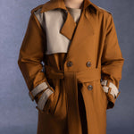 This stylish long camel trench coat features belt details on the sleeves and classic trench coat accents, enhanced with beige accents for a sophisticated touch. It is paired with matching camel pants, creating a cohesive and chic look.