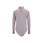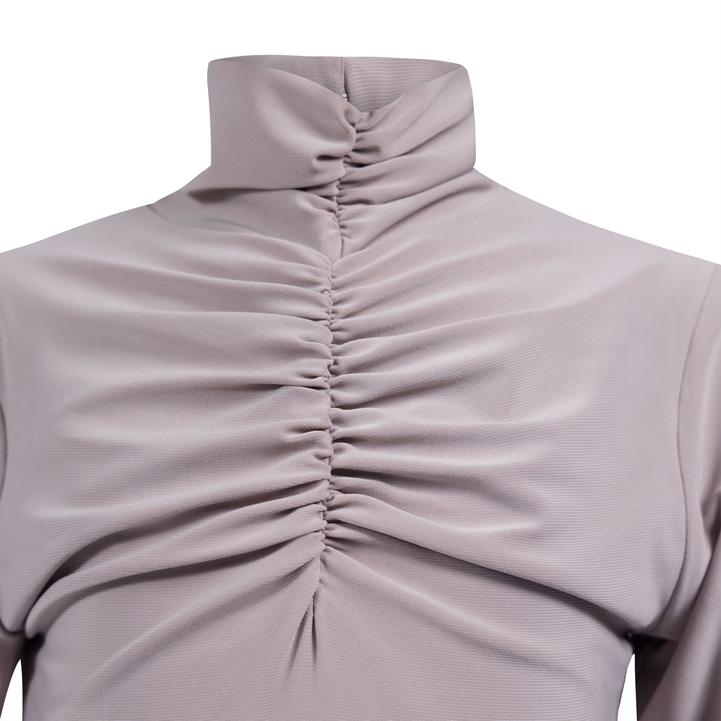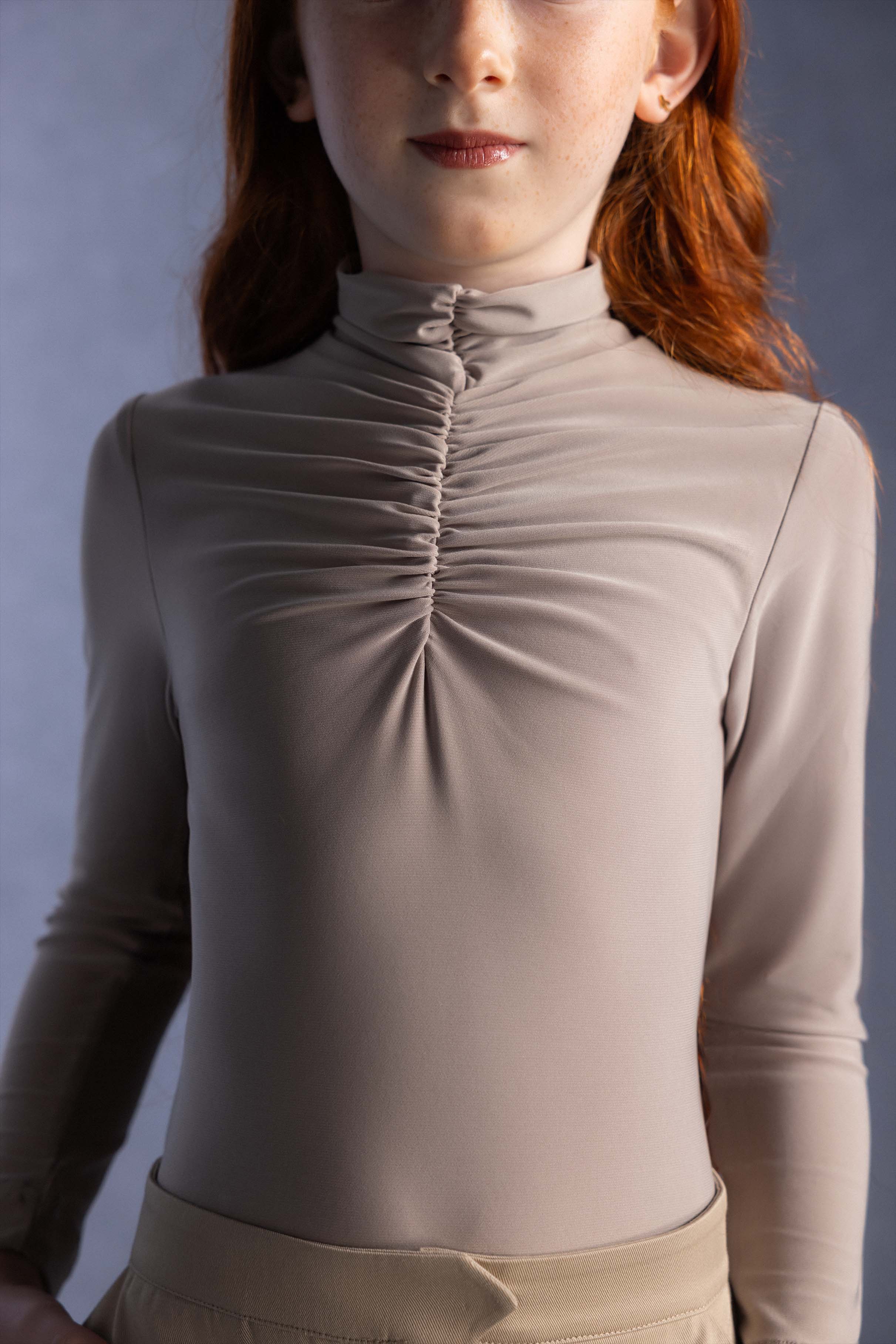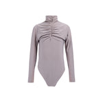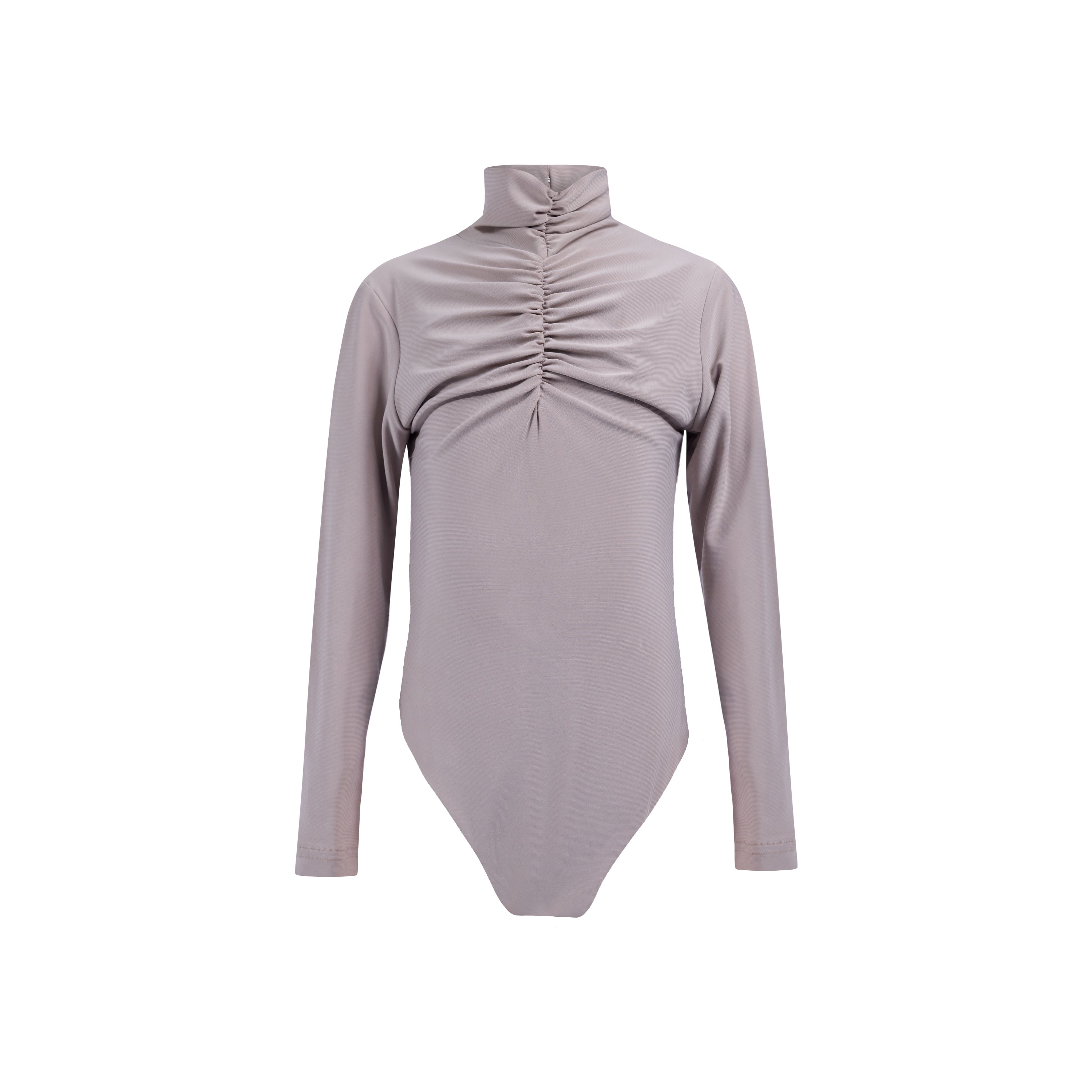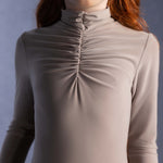A beige long-sleeved bodysuit featuring a high ruched neckline and intricate pleating details on the chest, offering a sophisticated and flattering silhouette with a touch of texture and elegance.