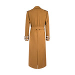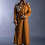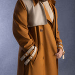 This stylish long camel trench coat featured belt details on the sleeves complemented by beige accents. It is paired with matching camel pants, creating a cohesive and elegant look.