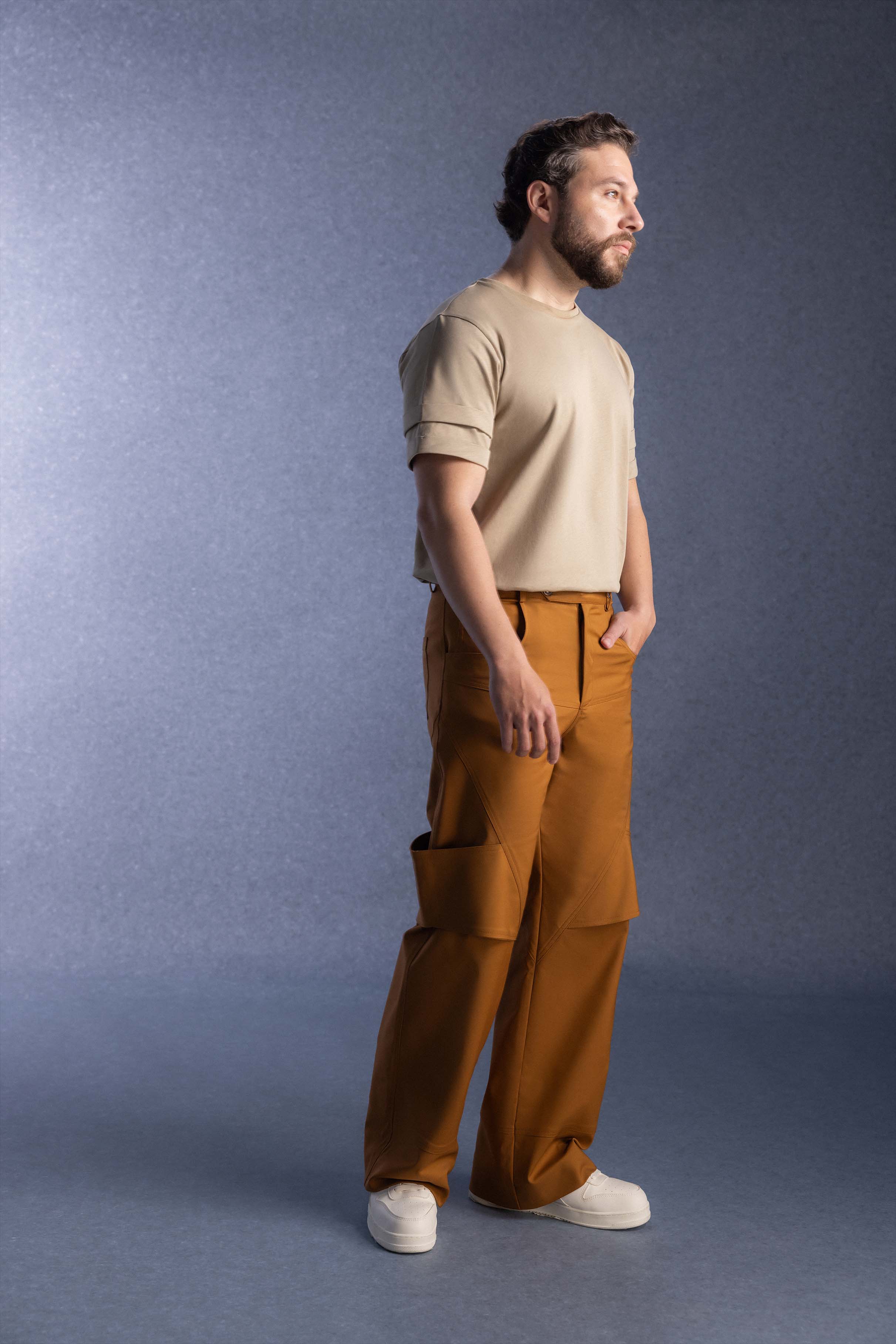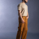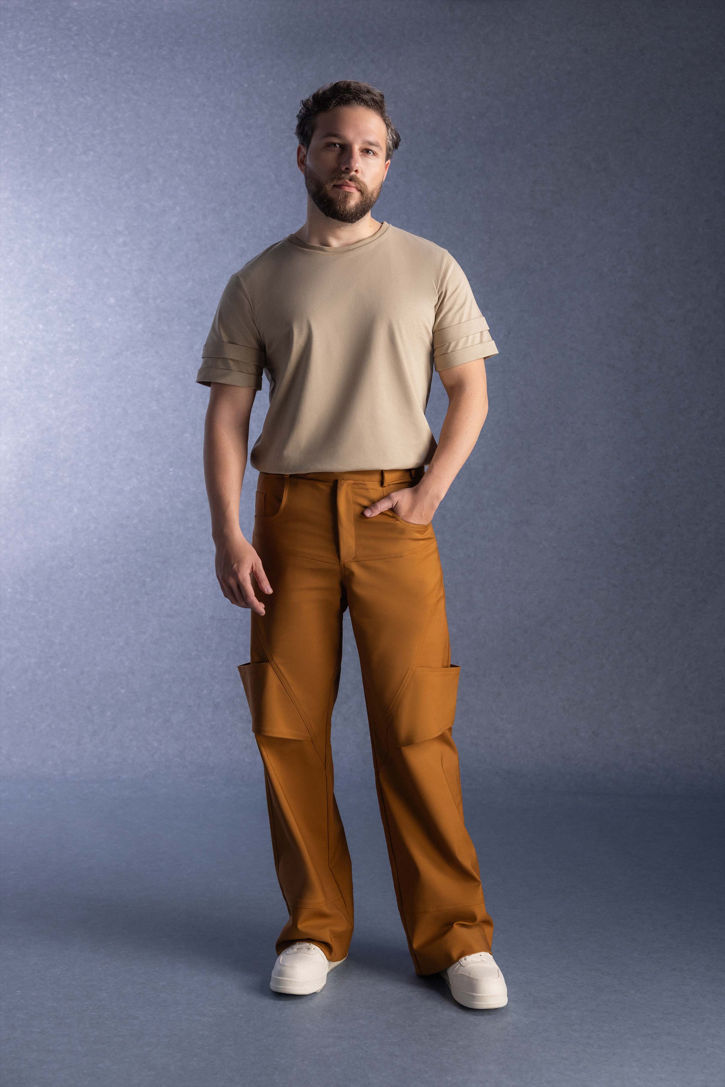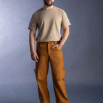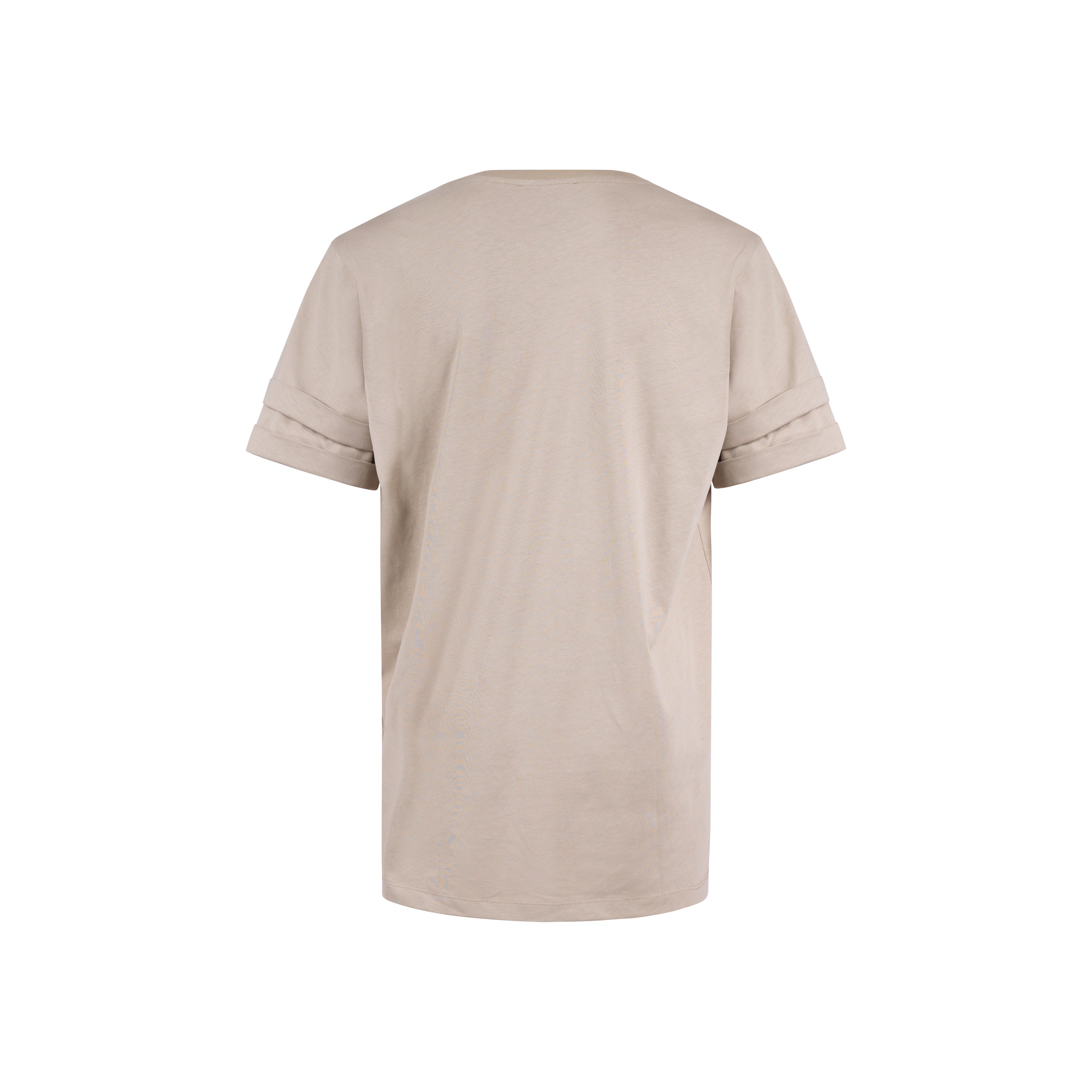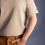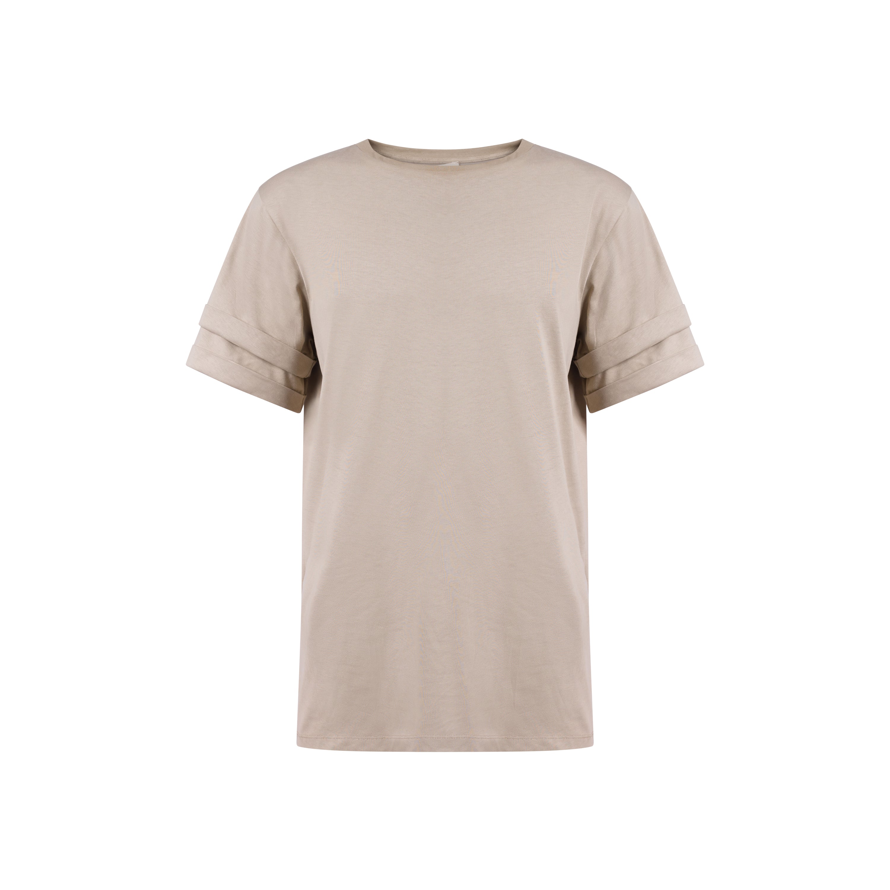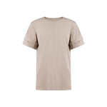 A relaxed and comfortable short-sleeve beige top, designed with rolled sleeves for a casual, effortless look. The round neckline adds to its simple yet timeless appeal, making it a versatile piece that pairs easily with any outfit for a laid-back yet stylish appearance.