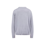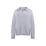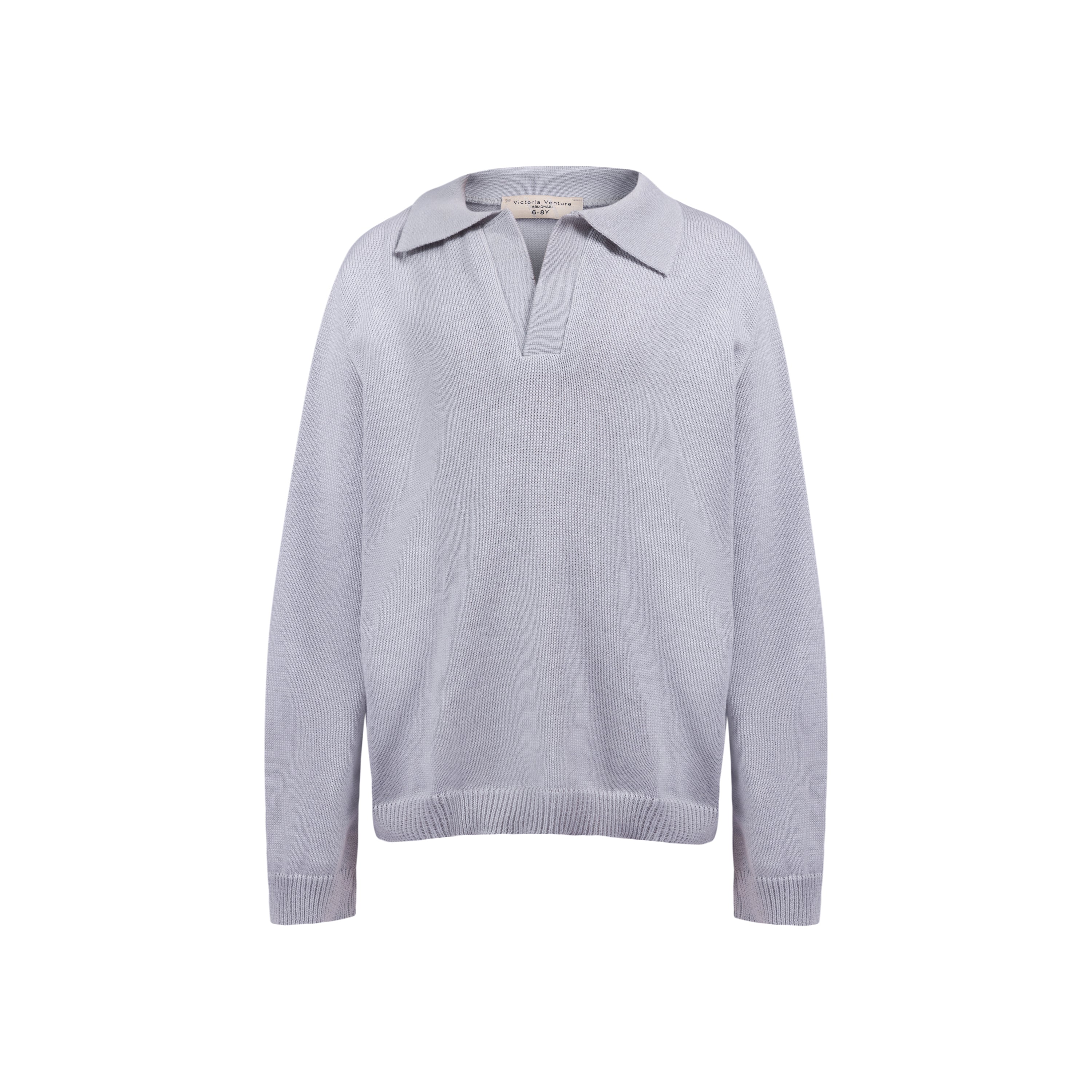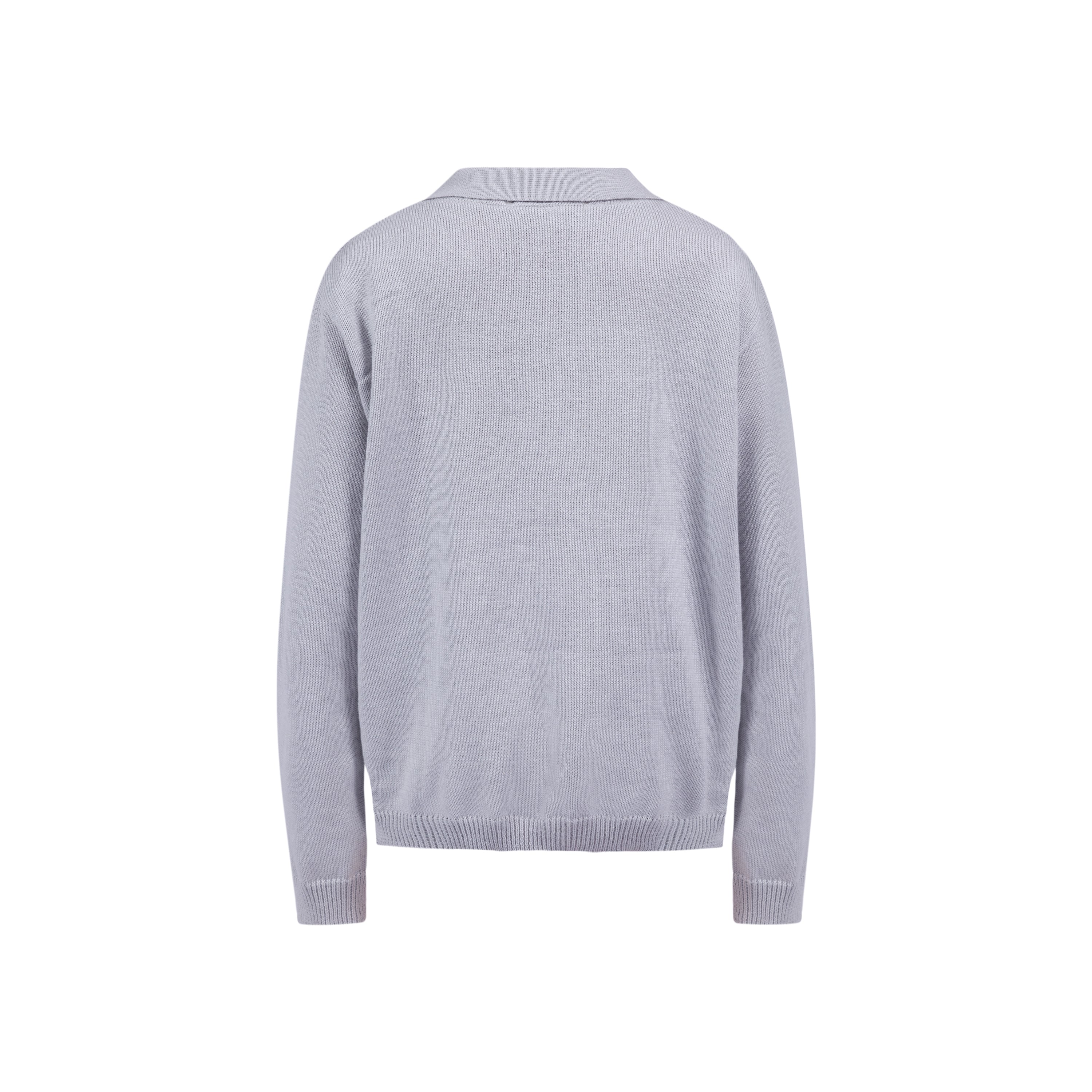 A knitted grey polo sweater, offering a classic yet stylish look. The soft knit fabric provides warmth and comfort, while the polo collar adds a refined touch to the design