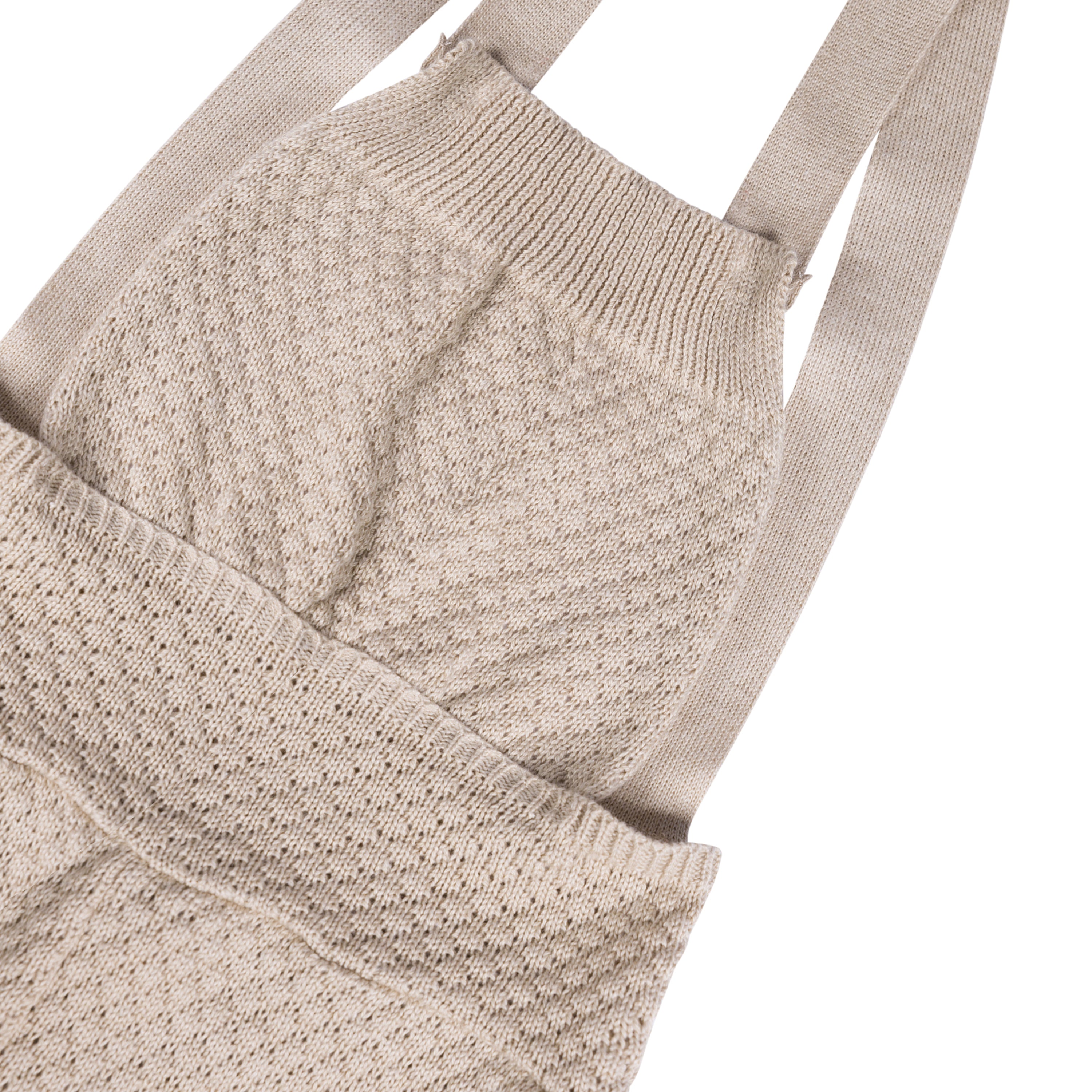 A grey knitwear jumpsuit featuring a light grey sweater underneath, creating a layered, cozy look. The combination of soft textures offers both style and comfort, making it a versatile and chic piece for cooler weather