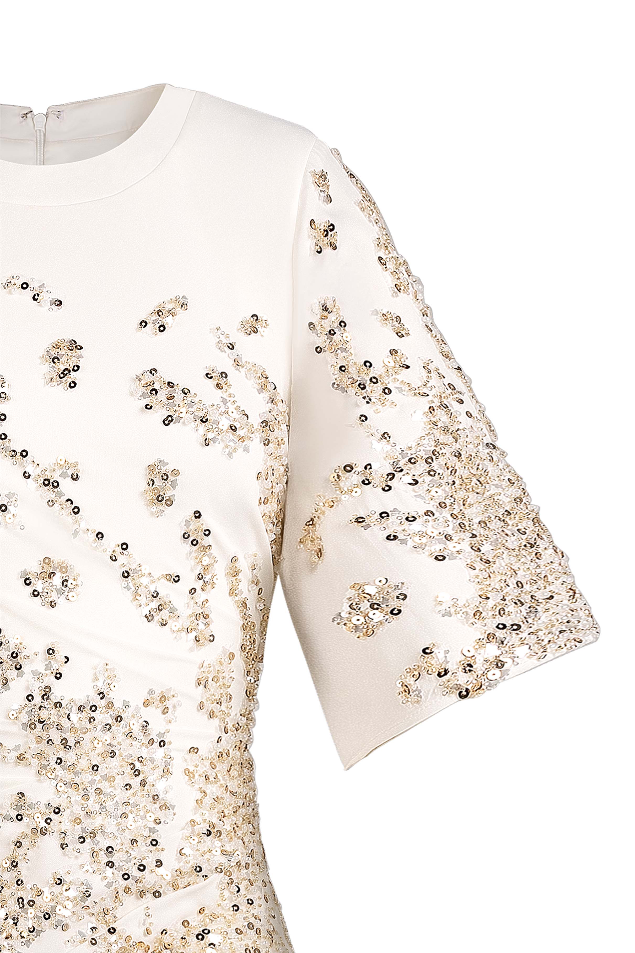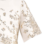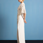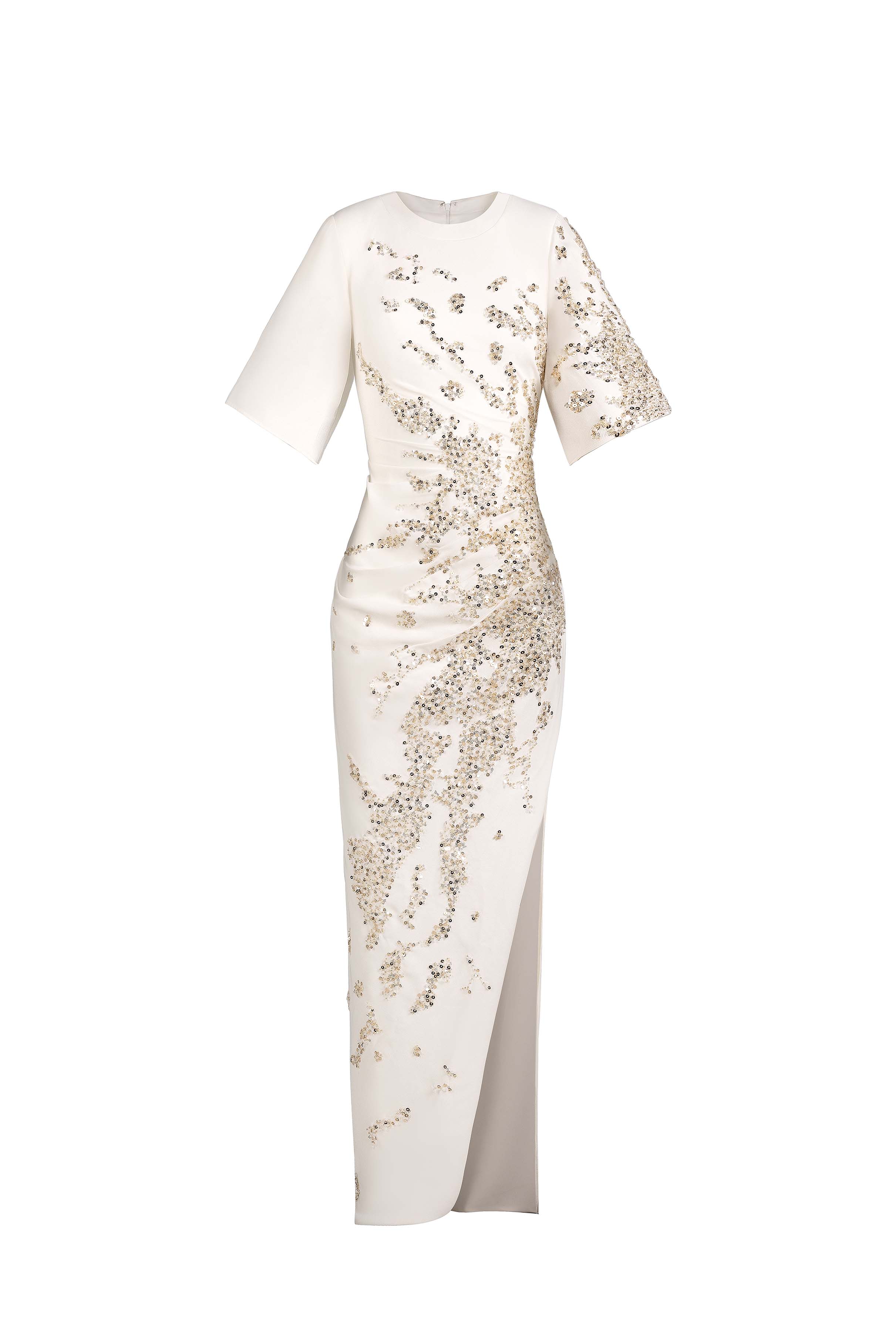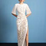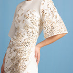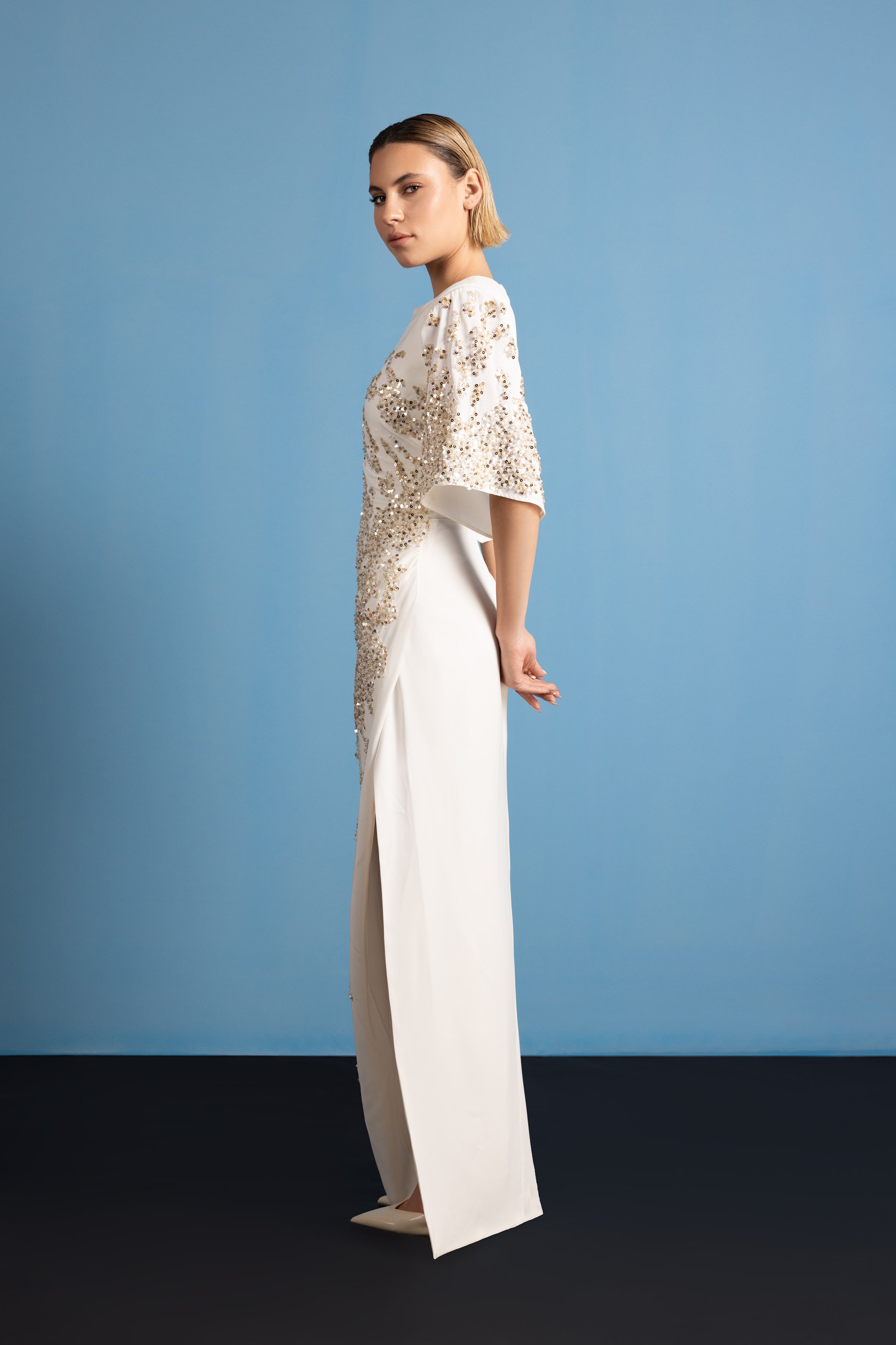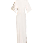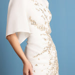 White crepe dress with structured shoulders and bell sleeves. Draped waist with gold embellishment across the front.