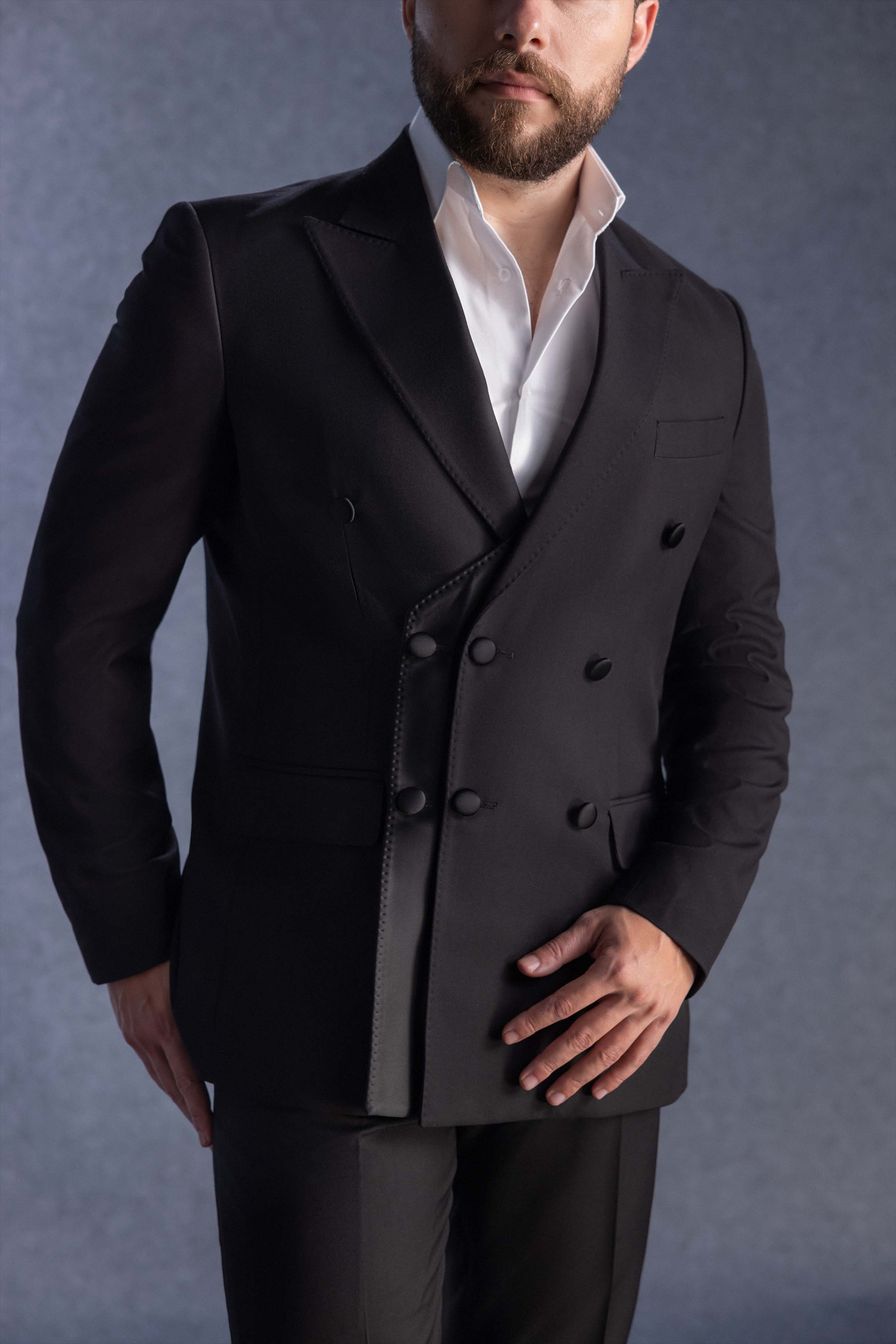 Elevate your wardrobe with this double-layered wool dubetti jacket, featuring a sleek satin bottom layer and refined satin button detailing. Paired with tailored French trousers, this elegant suit offers timeless sophistication. Available in classic black and versatile taupe, it’s the perfect blend of luxury and style for any occasion