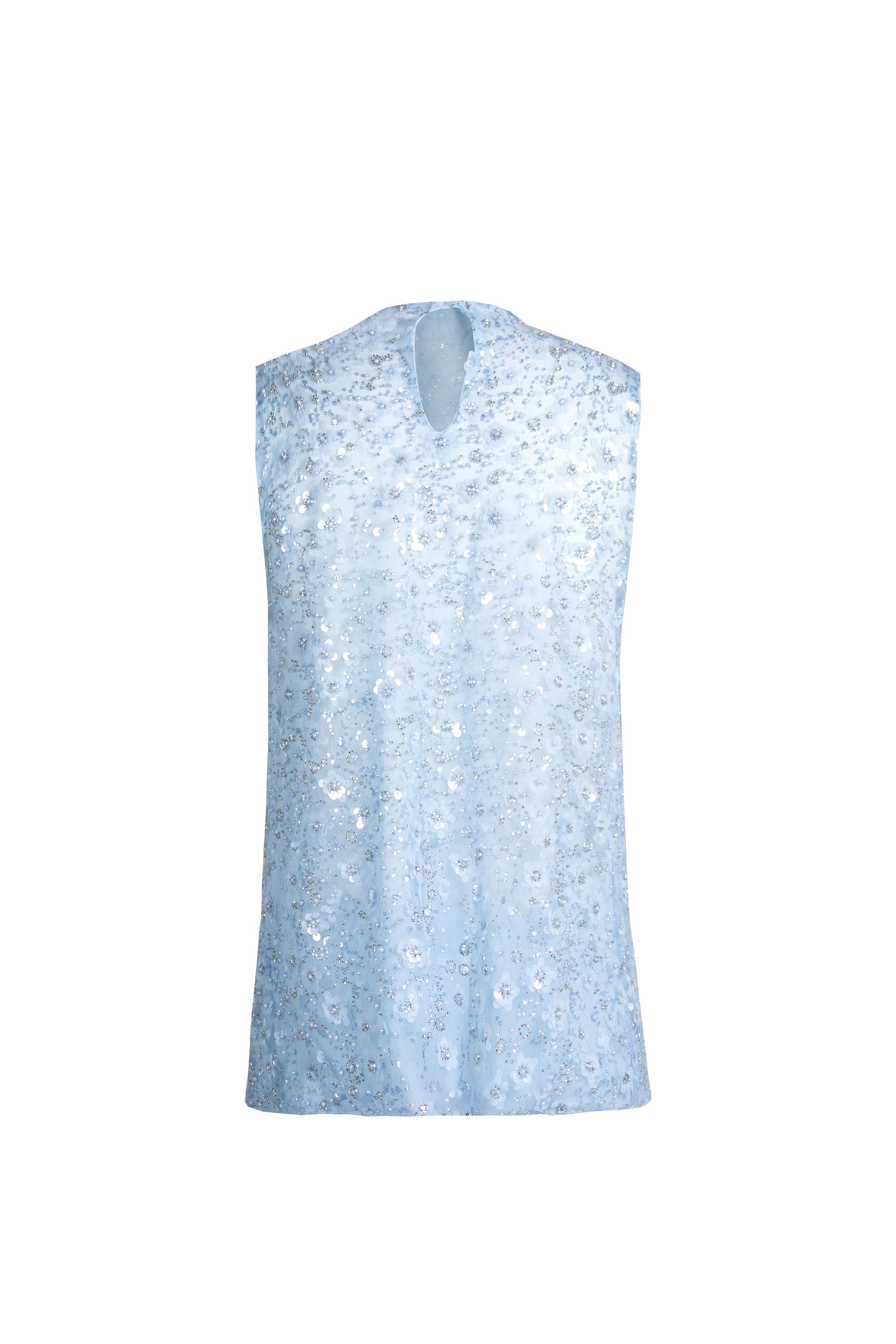 Sleeveless high-neck top in a loose silhouette. Sheer fabric with floral embellishments.