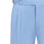 Loose-fit pleated flared pants with structured wide waistband, two slant pockets and adjustable side buckles.