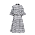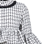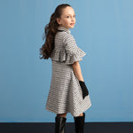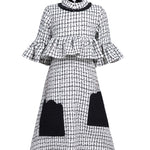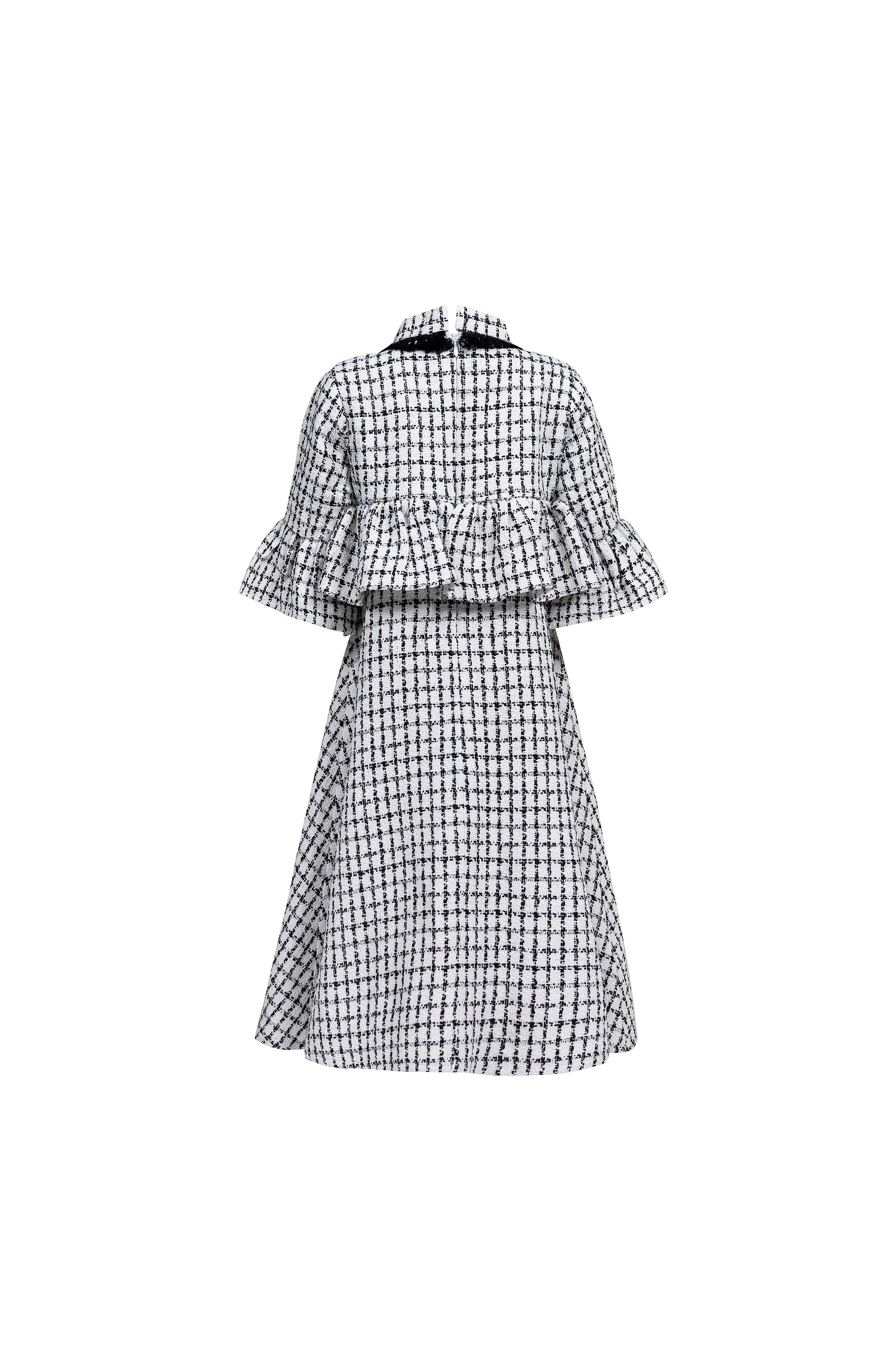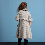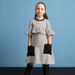 Flared dress featuring ruffled sleeves, two doodle pockets on the front and contrasting details around the neck and sleeves.