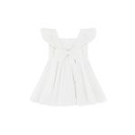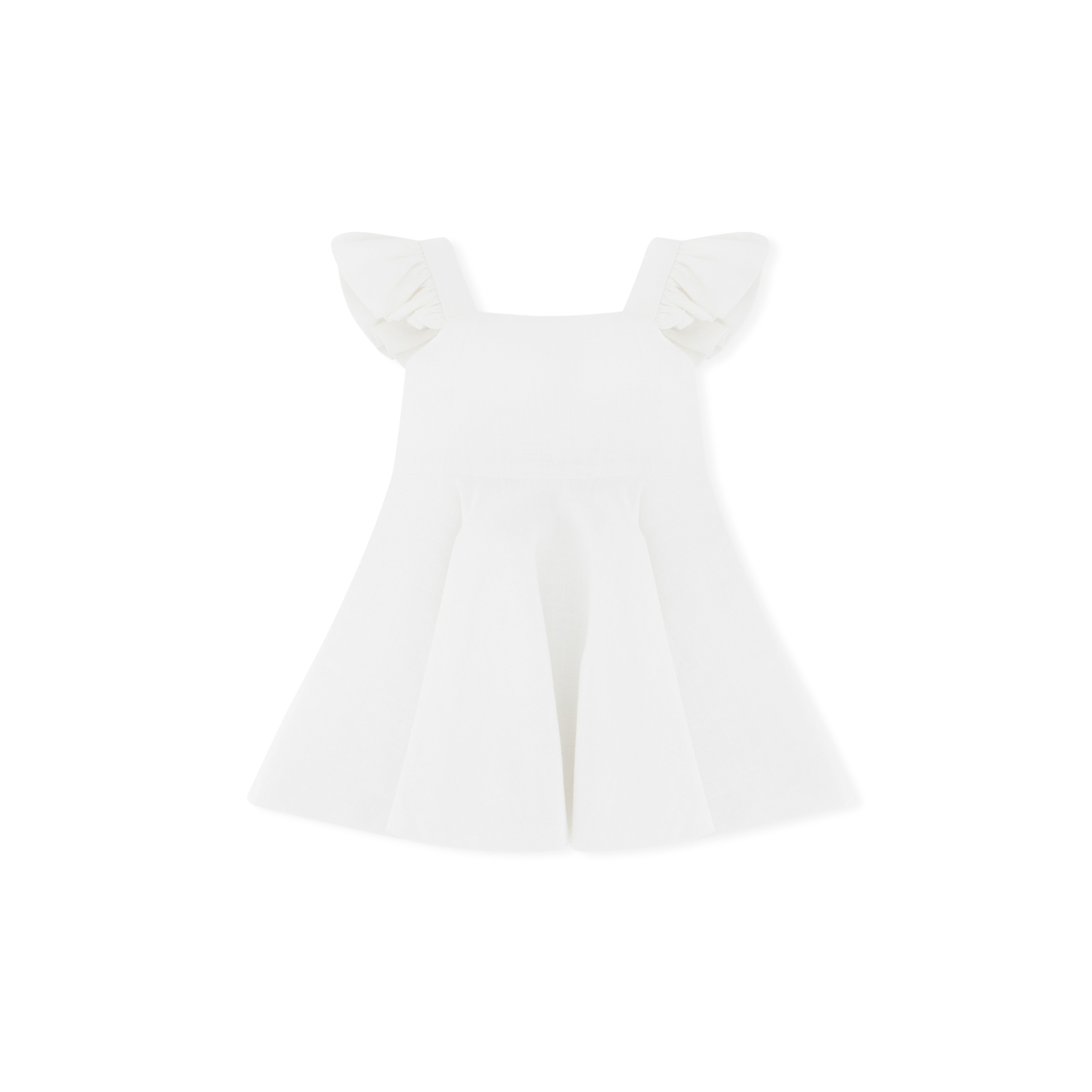 Dress your littlest one in the Desert Dune Baby Dress, featuring a delicate off-white color. This A-line dress is crafted from 100% linen and adorned with elegant pleats and charming ribbon detailing, making it perfect for special occasions or adorable everyday wear.