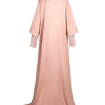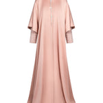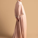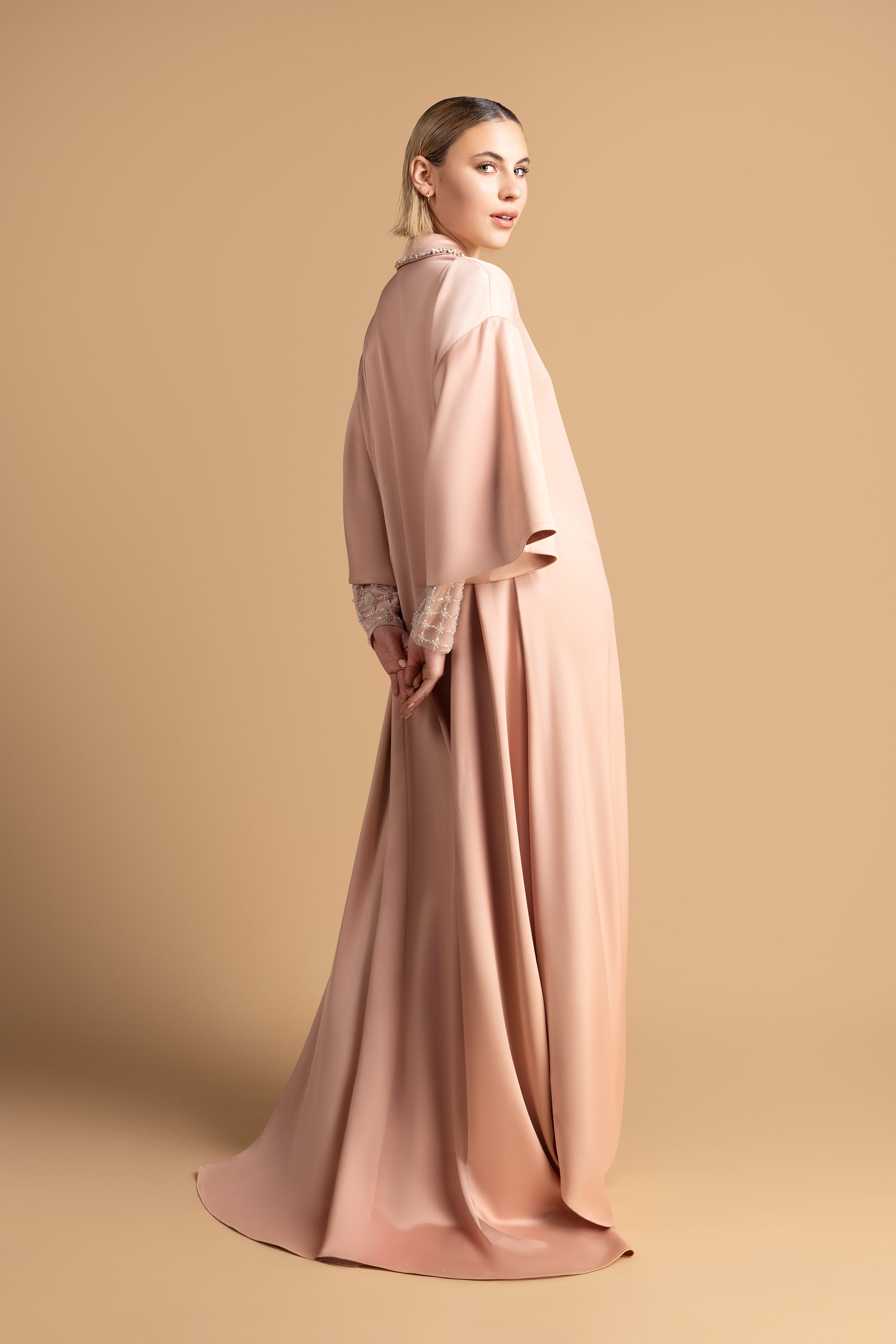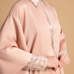 Make a bold statement with this exquisite shirt abaya dress, designed to captivate attention. Featuring unique double sleeves—one long and fitted with intricate embellishments, and the other short and wide—this dress combines modern style with timeless elegance. The embellished collar and eye-catching brooches on the front add a touch of luxury and sophistication, making this piece perfect for any special occasion.