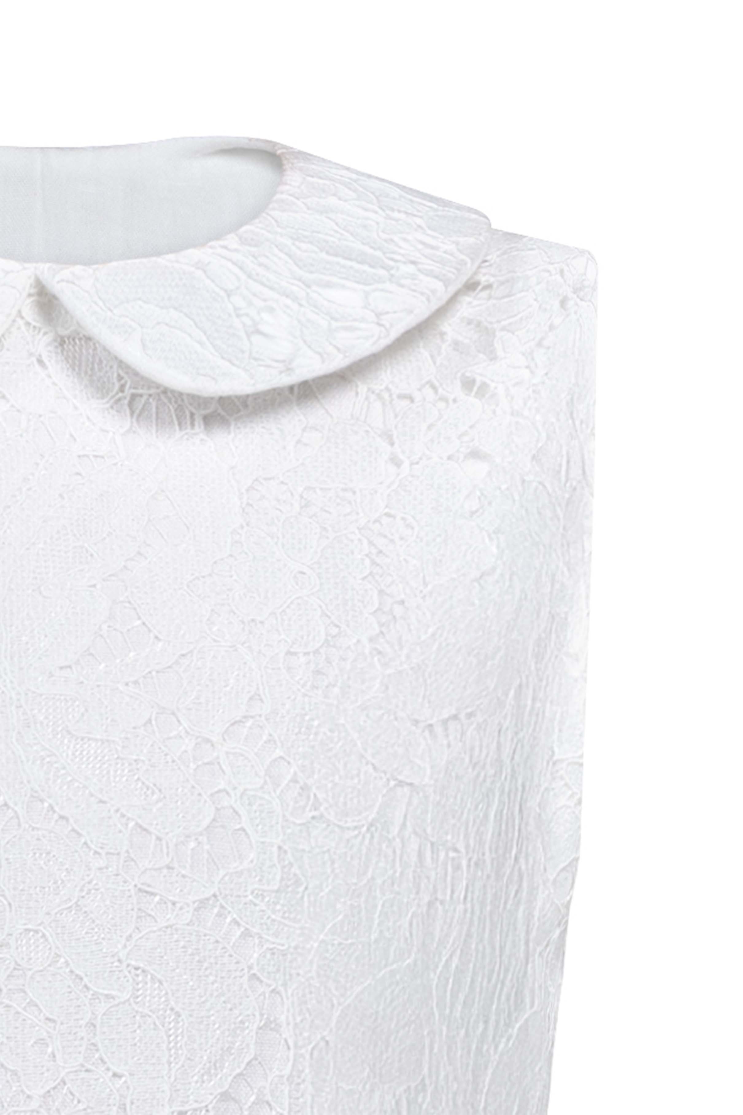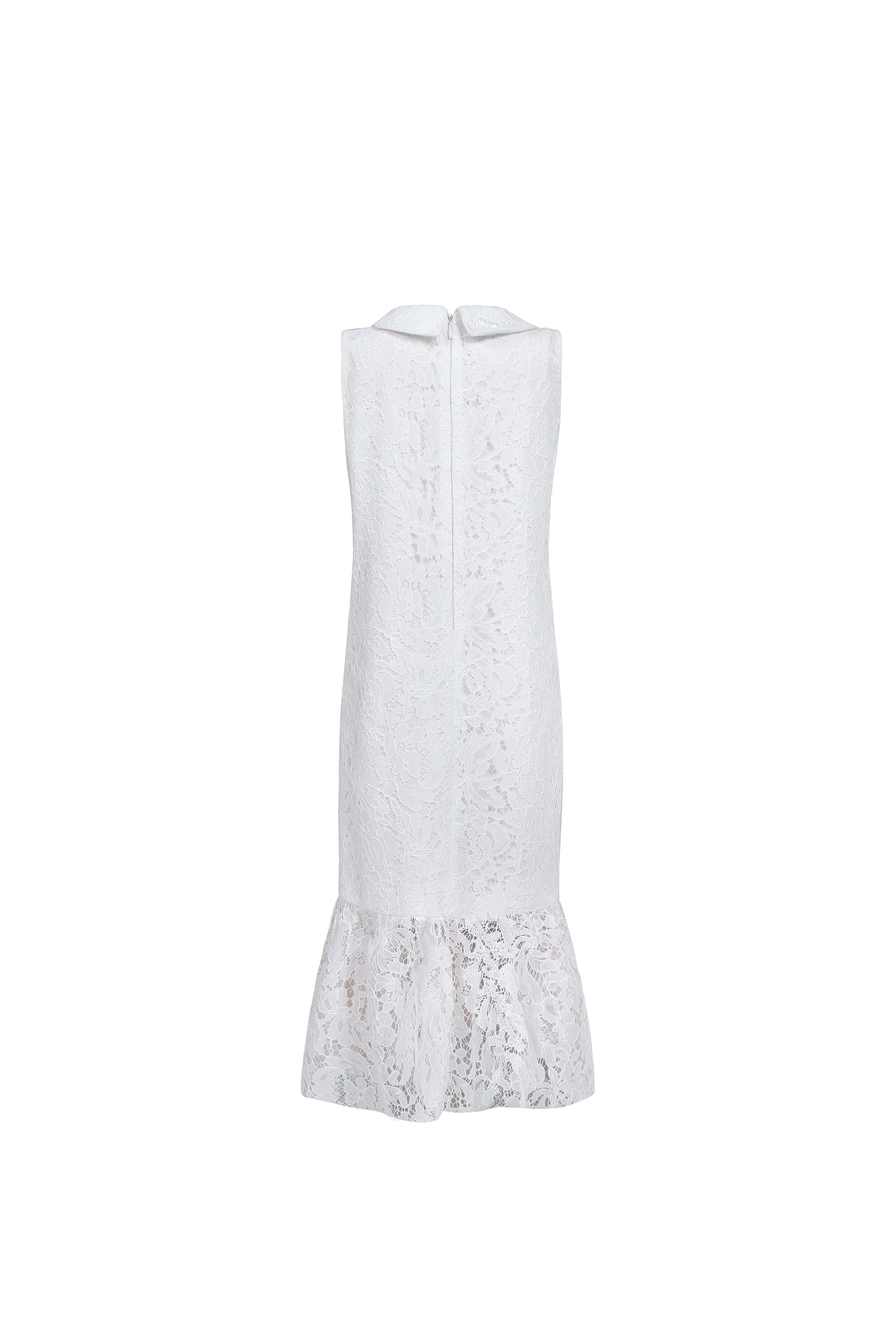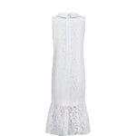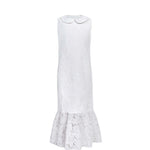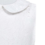 Sleeveless lace dress, fitted bodice with a Peter Pan collar. Ruffled hem. Linen lining.