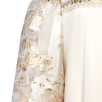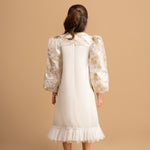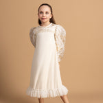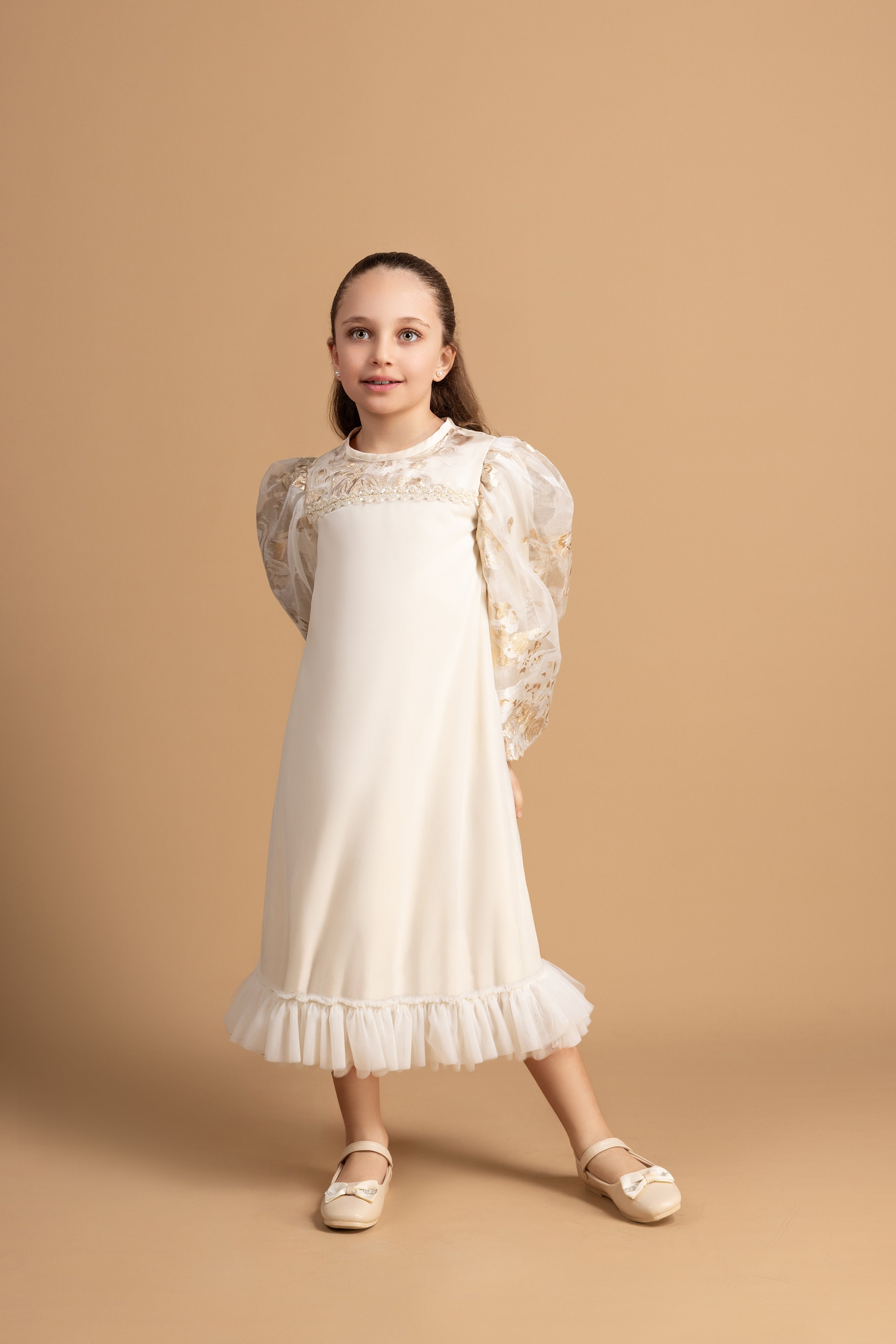 Step into elegance with this luxurious dress, crafted from opulent organza brocade. The dress features enchanting tulle ruffles at the bottom and is adorned with radzmir fabric, adding texture and sophistication. Puffed sleeves and intricate embellishments on the bust area enhance its charm, making this dress perfect for any special occasion.