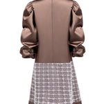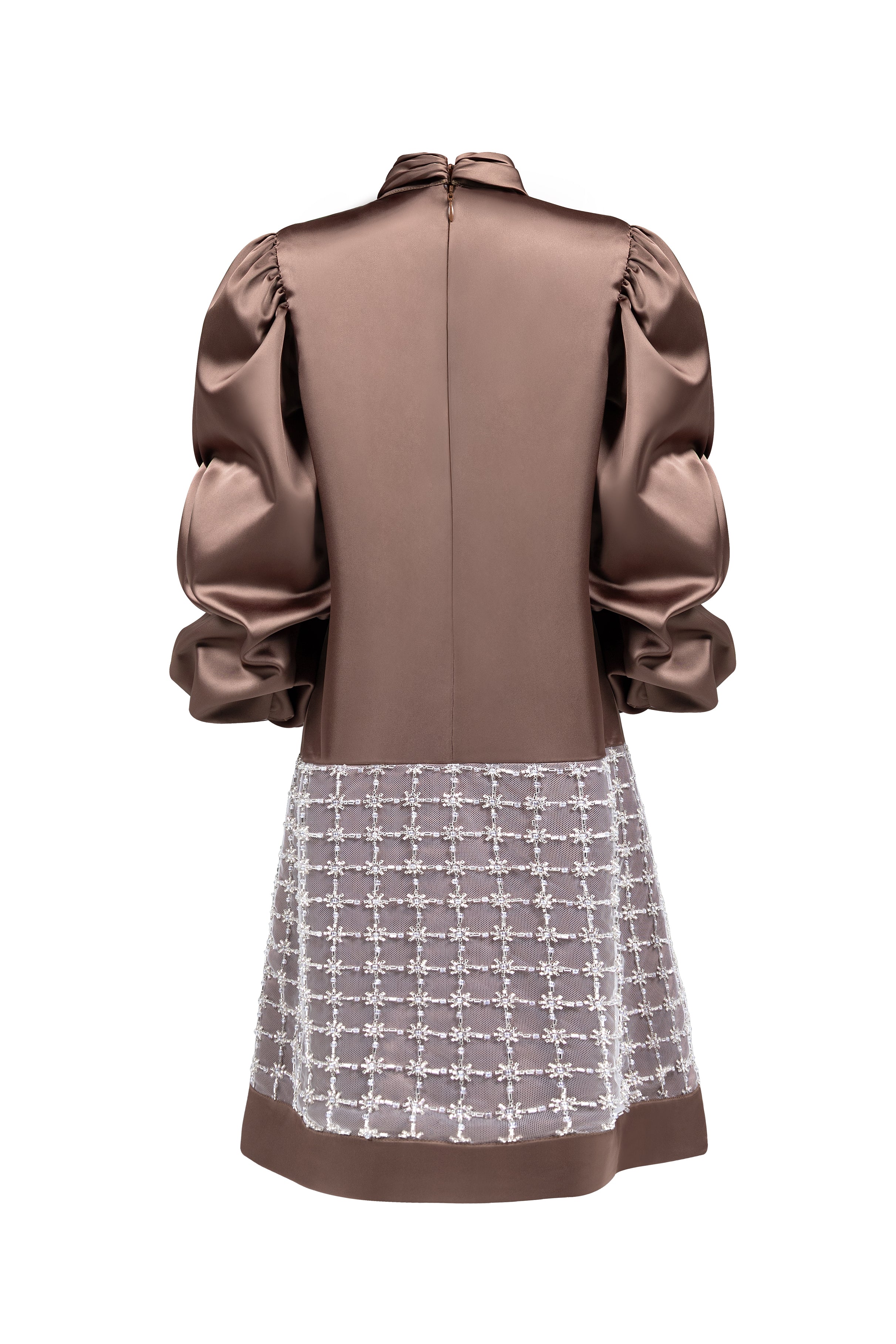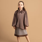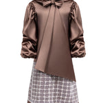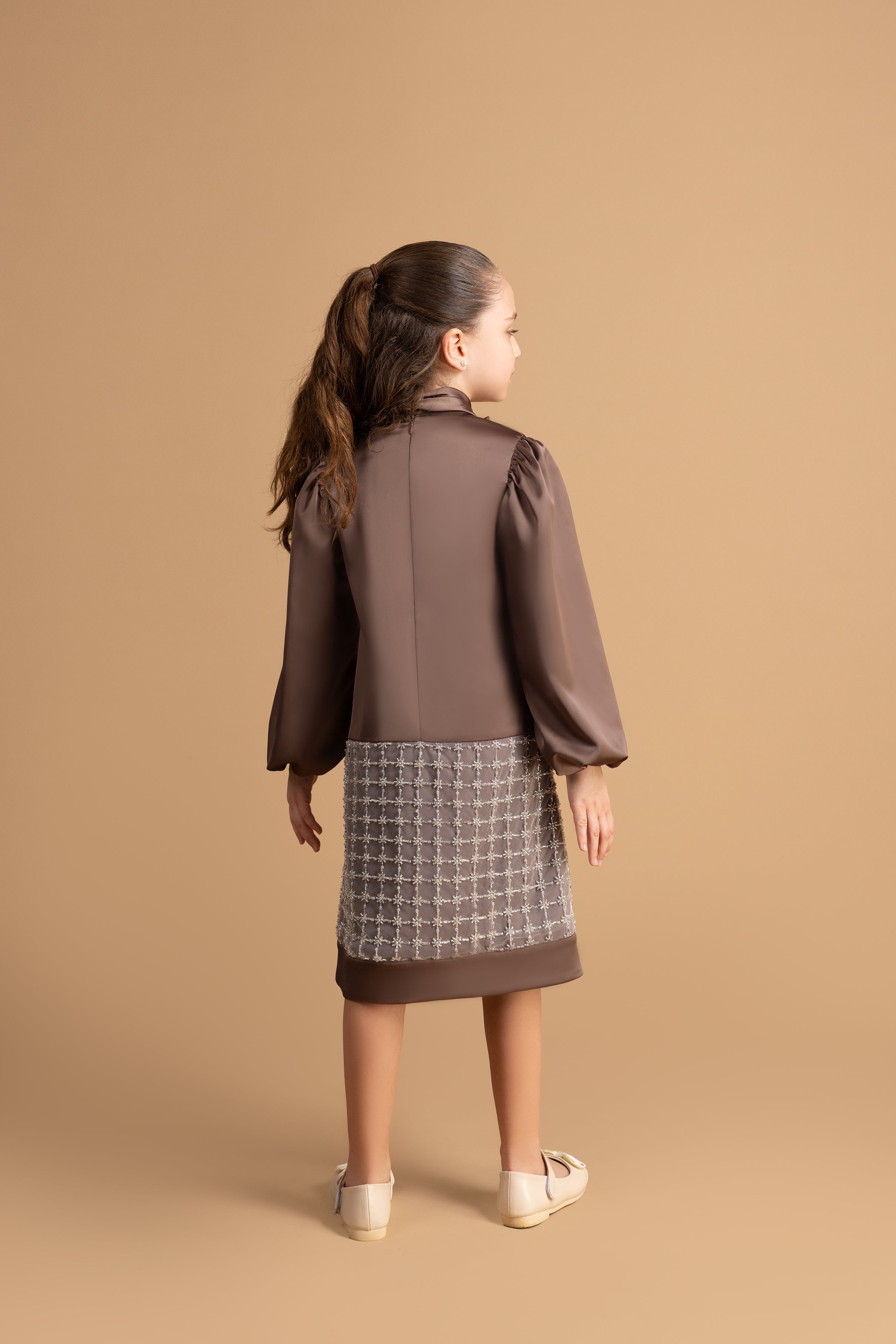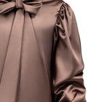 Adorn your little one in this enchanting silky satin dress, featuring elegant long balloon sleeves and a sophisticated draped collar. The dress is accentuated by a striking statement bow and an intricately embellished cut on the bottom, adding a touch of glamour and charm. Perfect for special occasions, this dress combines luxurious style with youthful elegance.