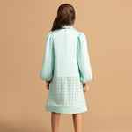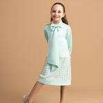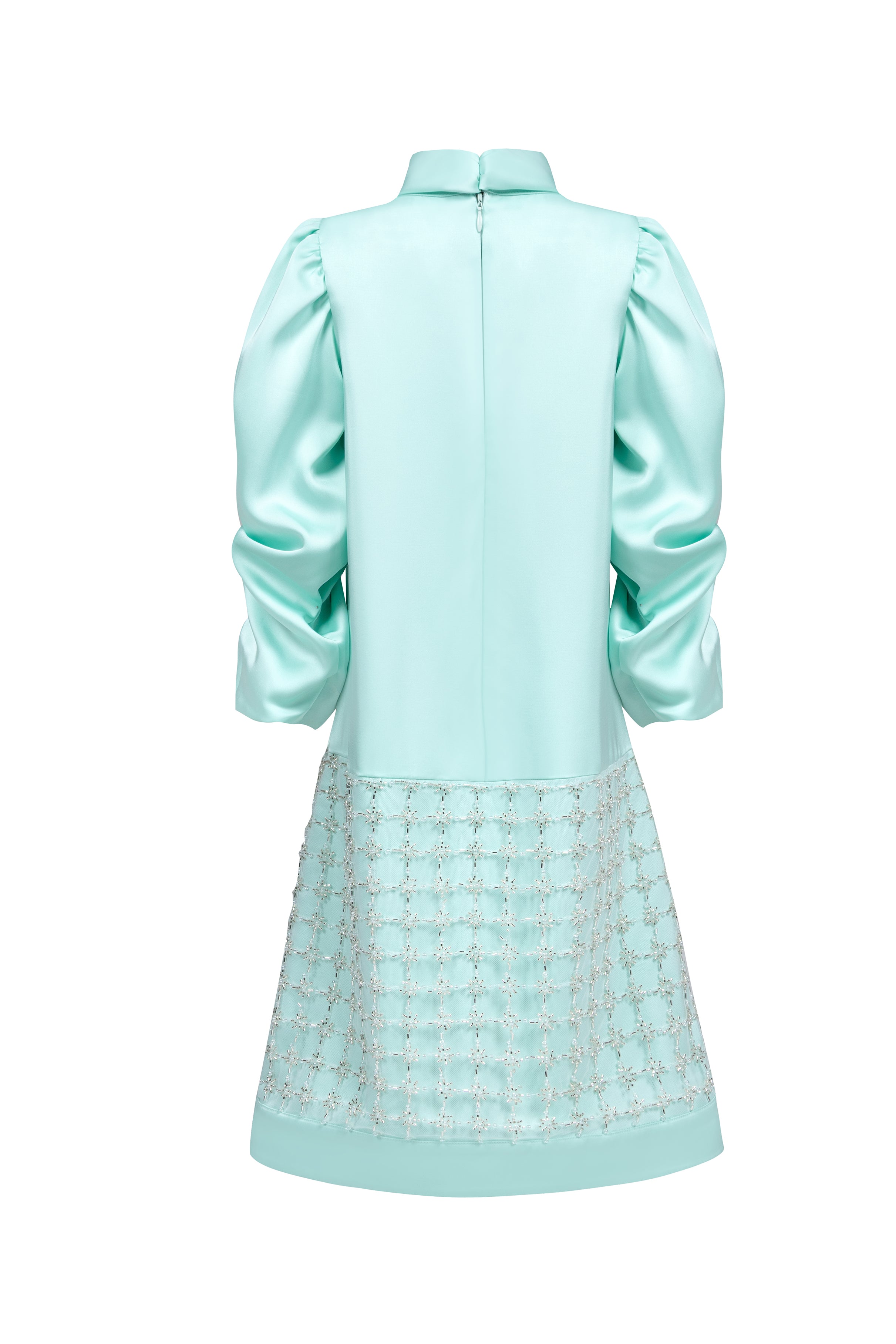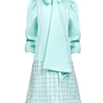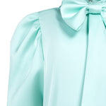 Adorn your little one in this enchanting silky satin dress, featuring elegant long balloon sleeves and a sophisticated draped collar. The dress is accentuated by a striking statement bow and an intricately embellished cut on the bottom, adding a touch of glamour and charm. Perfect for special occasions, this dress combines luxurious style with youthful elegance.