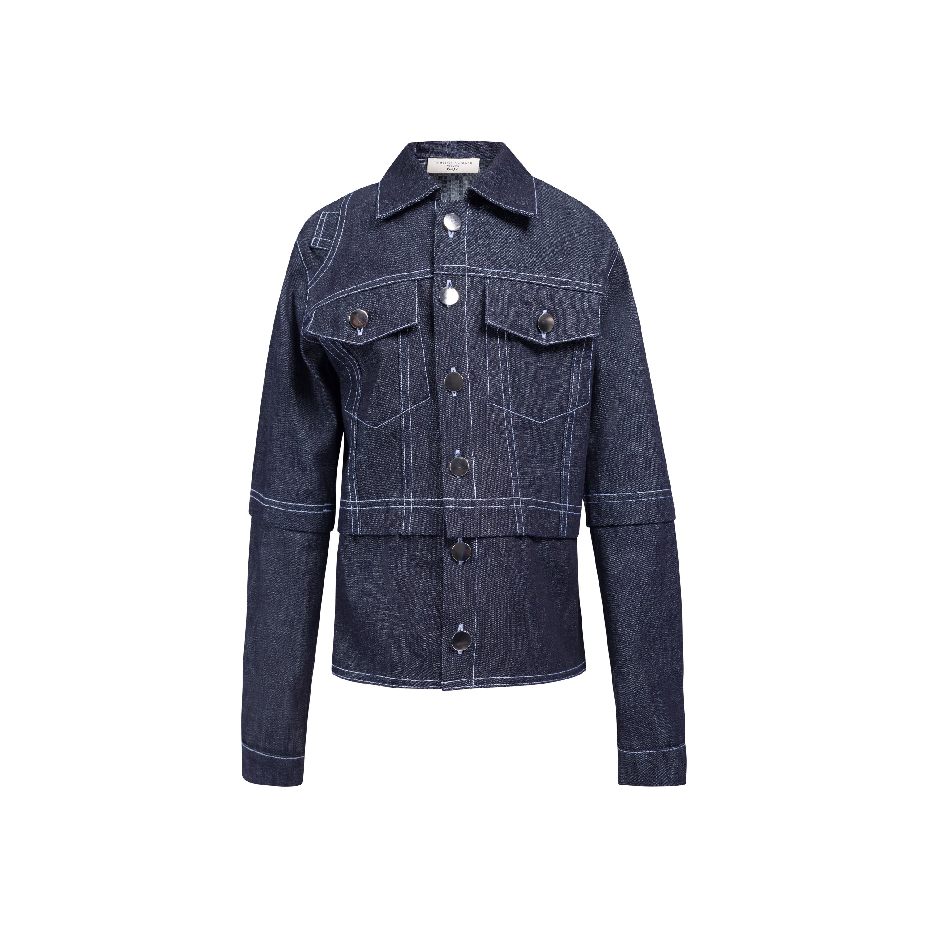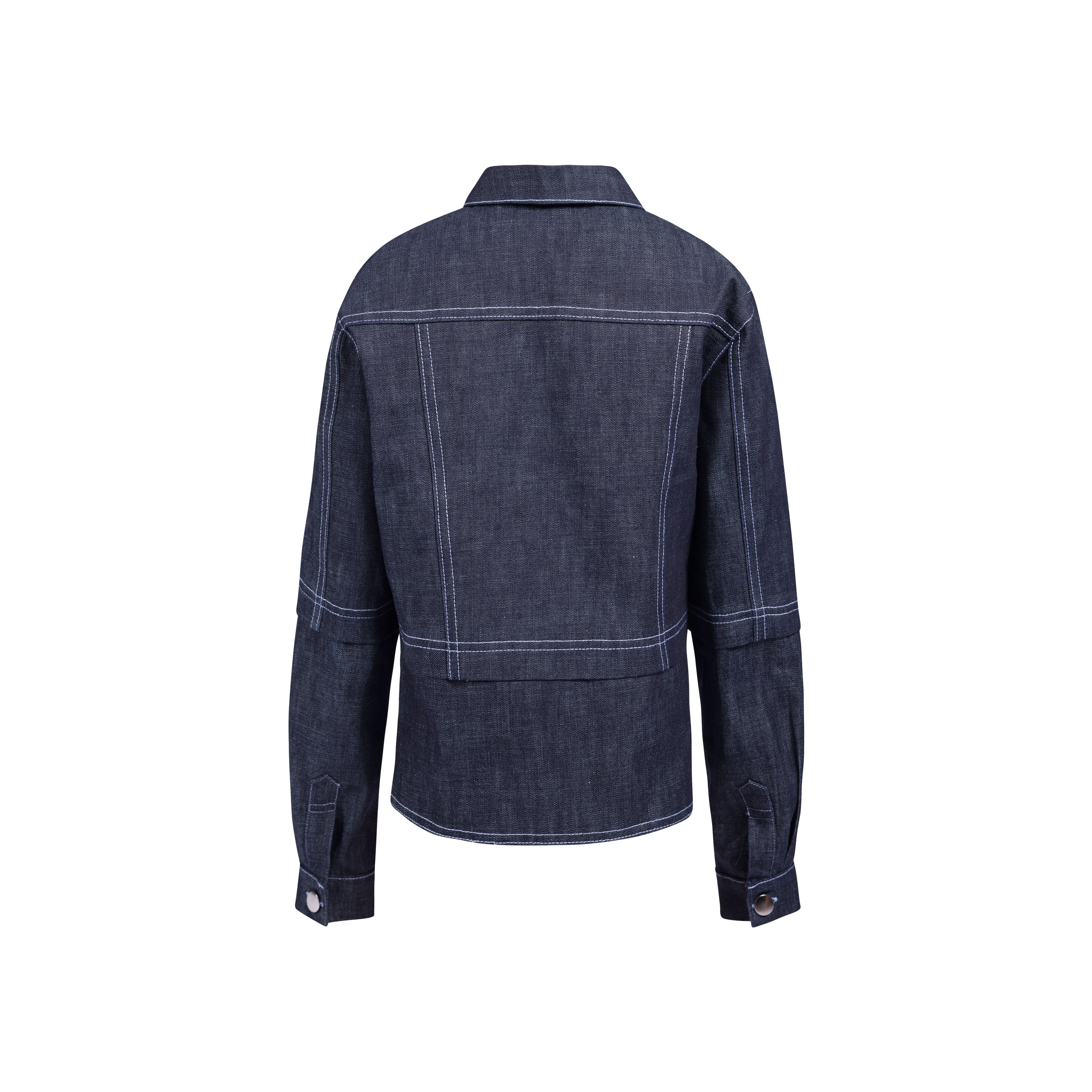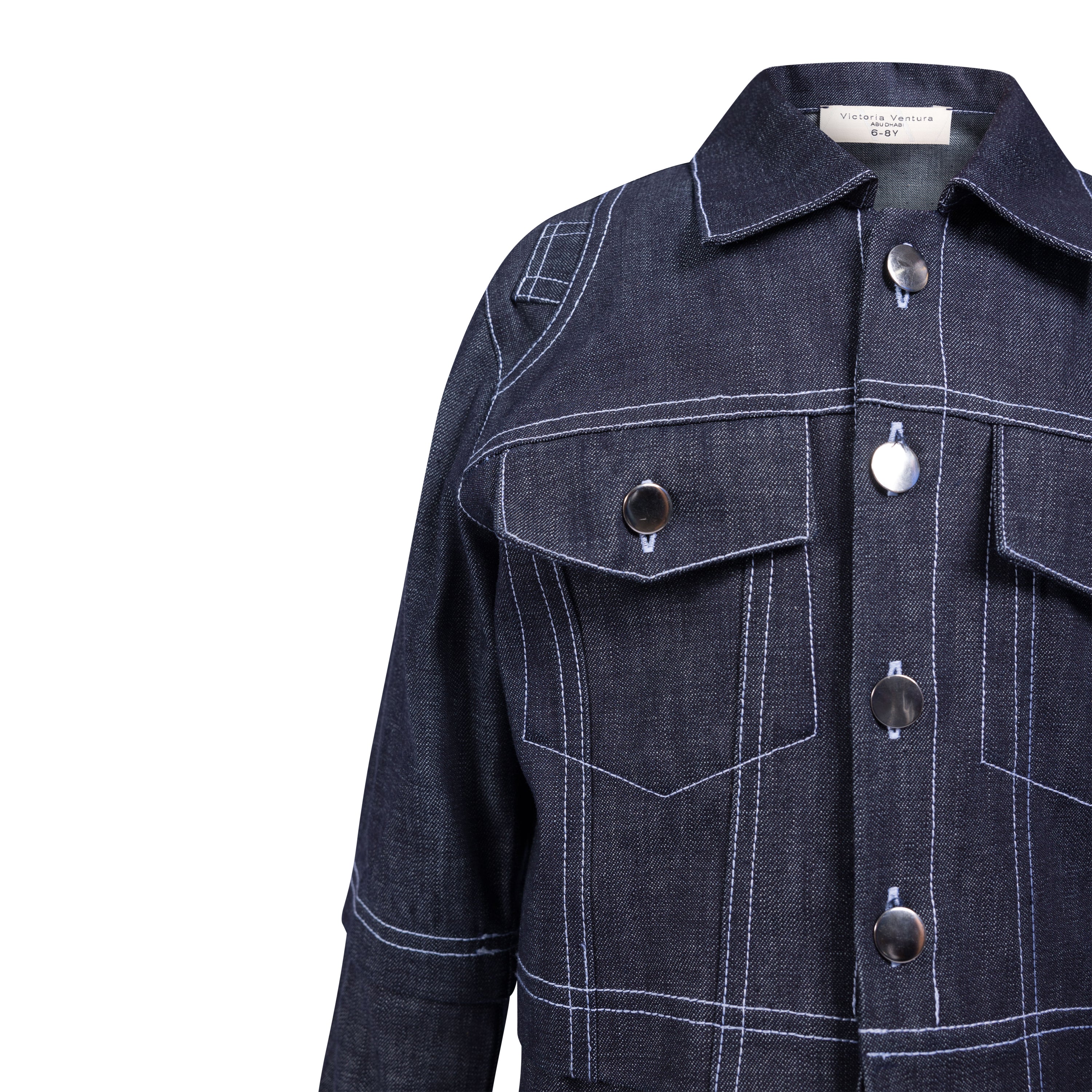 A navy blue denim jacket featuring white stitching details and a button-up front. It includes chest pockets, distinctive shoulder accents, and detailed sleeve stitching, with a flattering waist cut that adds structure and style to the design