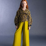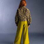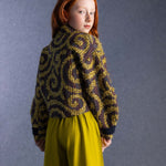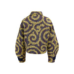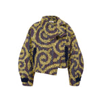 A vibrant patterned jacket featuring an eye-catching swirling design in contrasting dark and light colors. It is designed with long balloon sleeves and a slightly cropped length, adding a playful and dynamic touch to any outfit