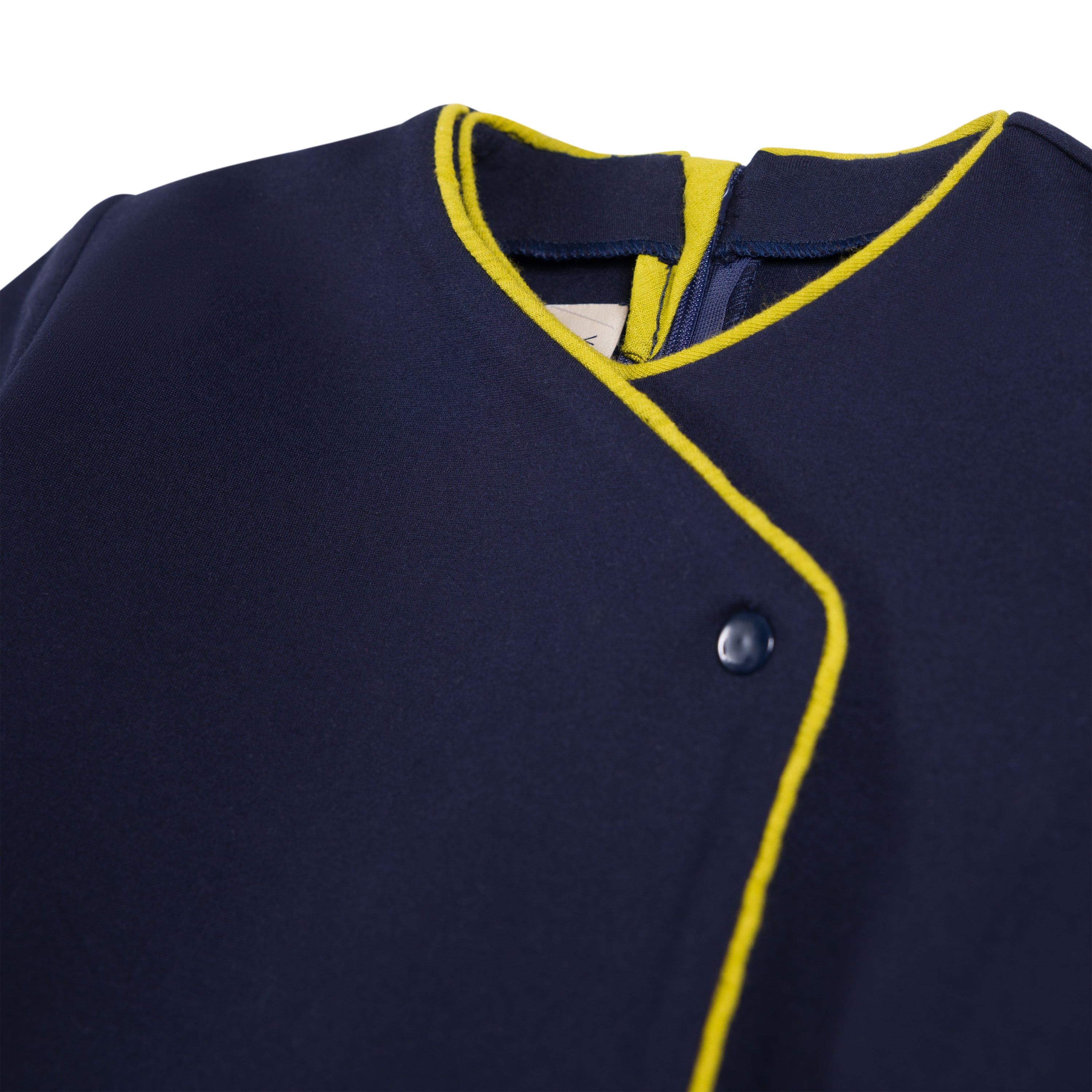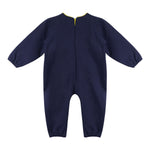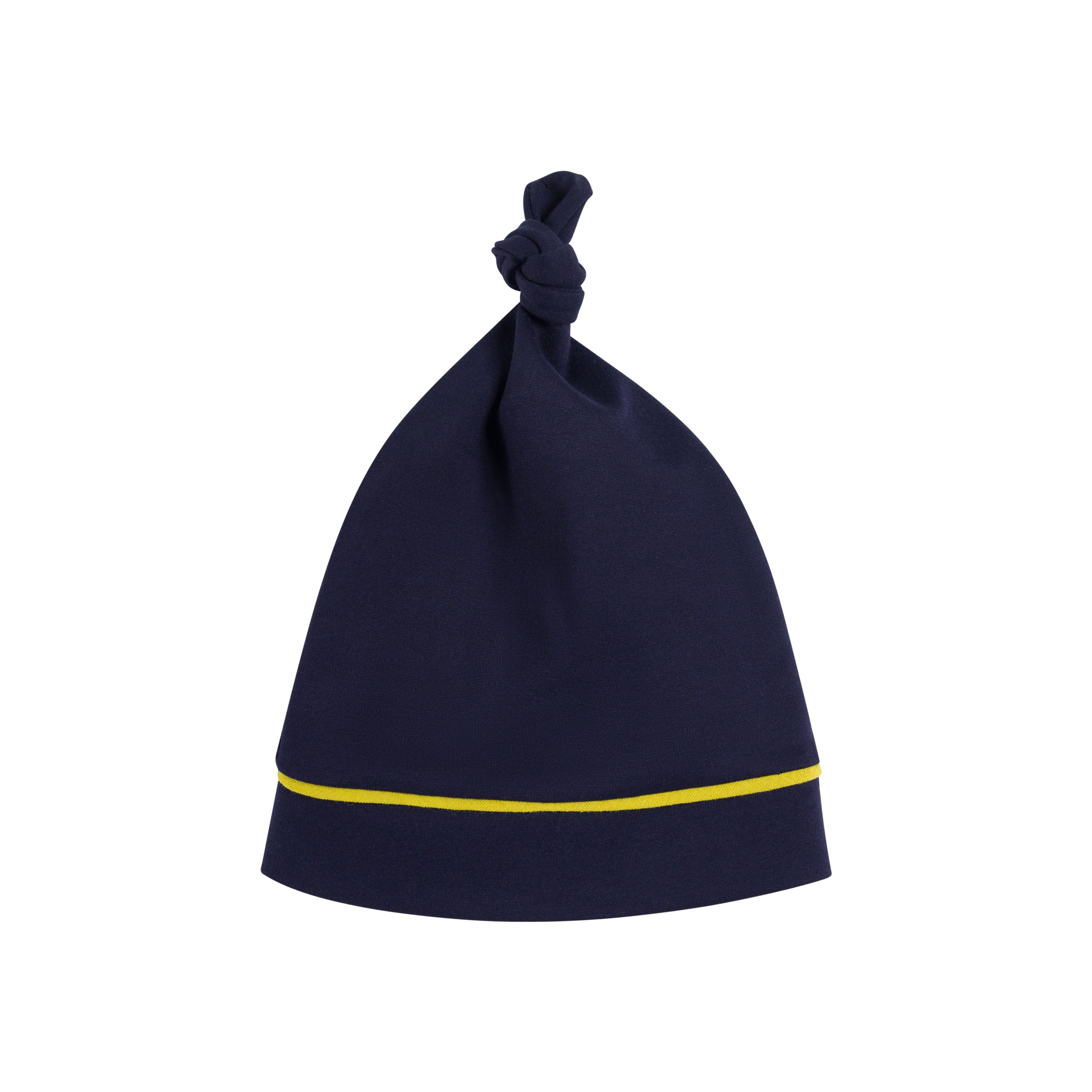 Long-sleeve, long-leg one-piece suit, designed with a wrap-style front closure and outlined with contrasting olive trim for a chic and modern look. The matching beanie, adorned with a knot at the top and olive trim around the edge, completes the outfit with a cozy and adorable touch