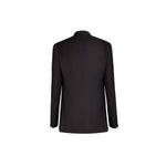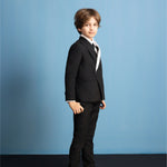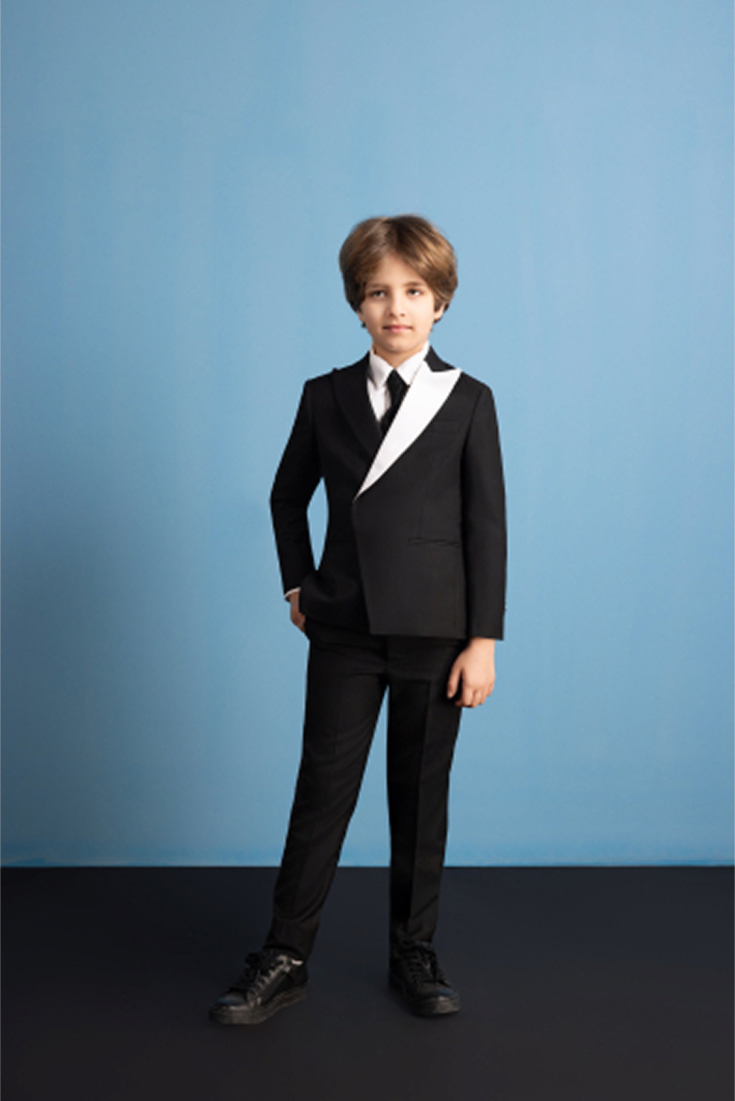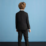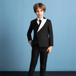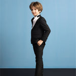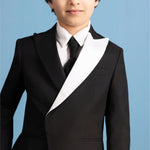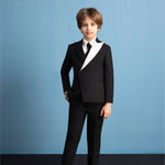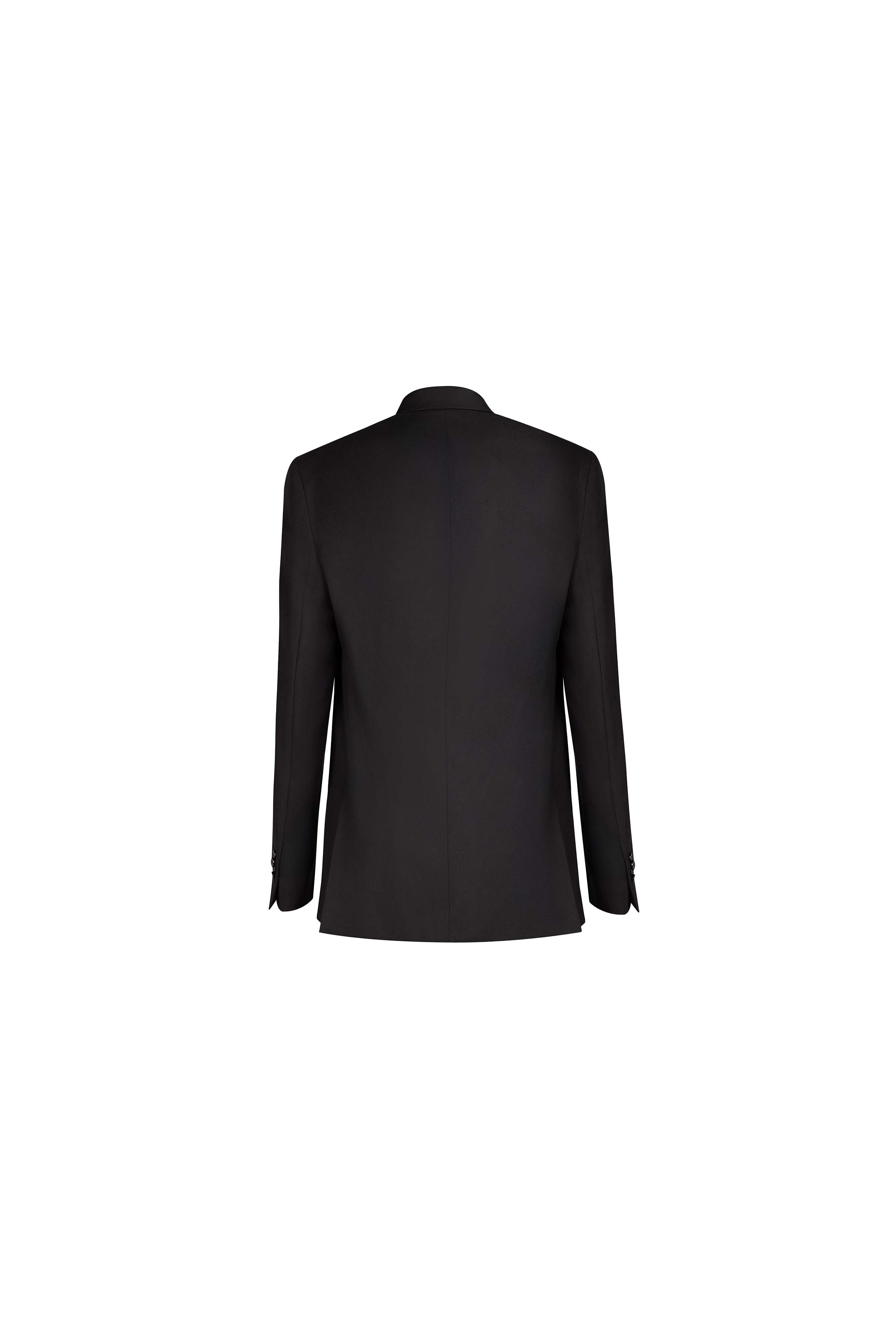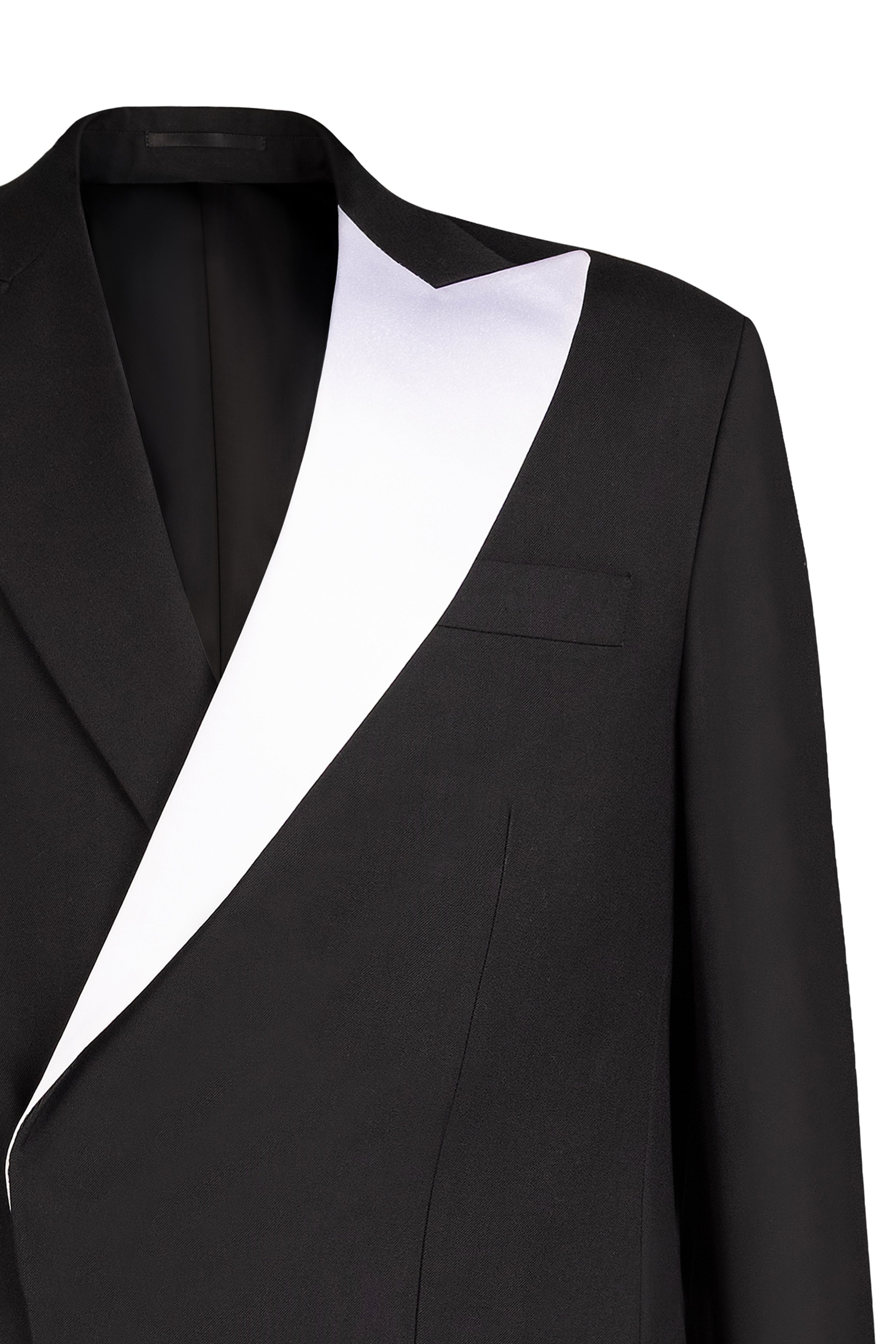 Slim fit tuxedo in black. White satin peak lapel collar. Long sleeves with buttoned cuffs. Welt pocket at the chest, piped pockets at the hip, and an inside pocket. Back vents. Hidden front button fastening. Matching trousers with front zip and button closure, side pockets, and welt pockets at the back.