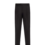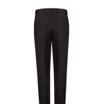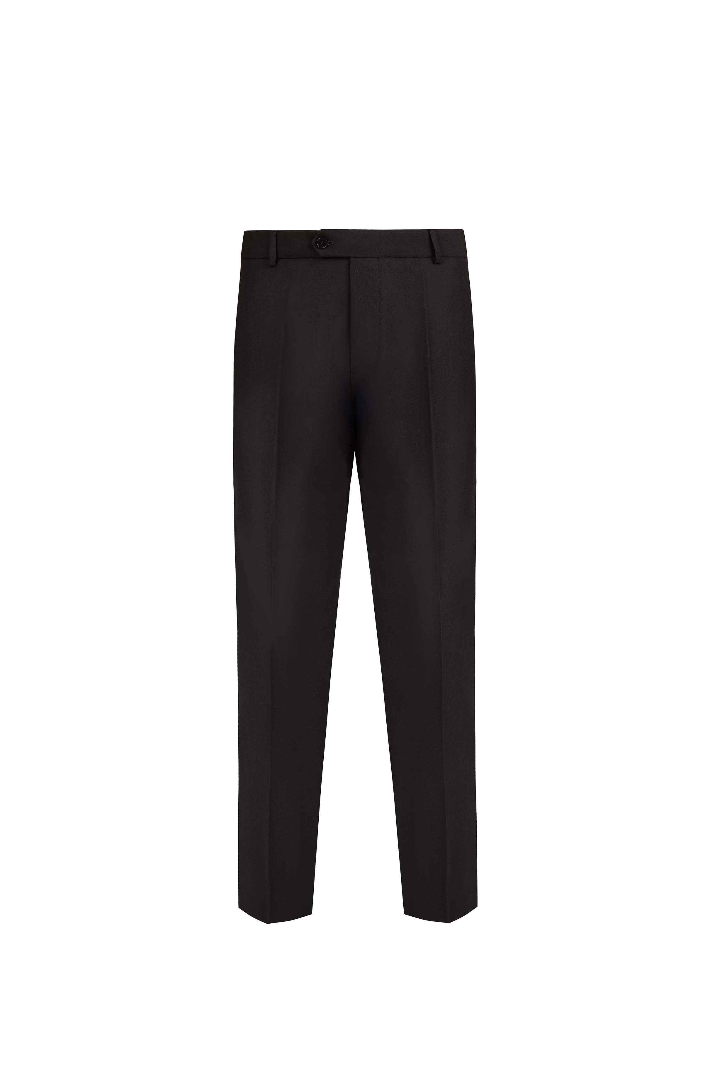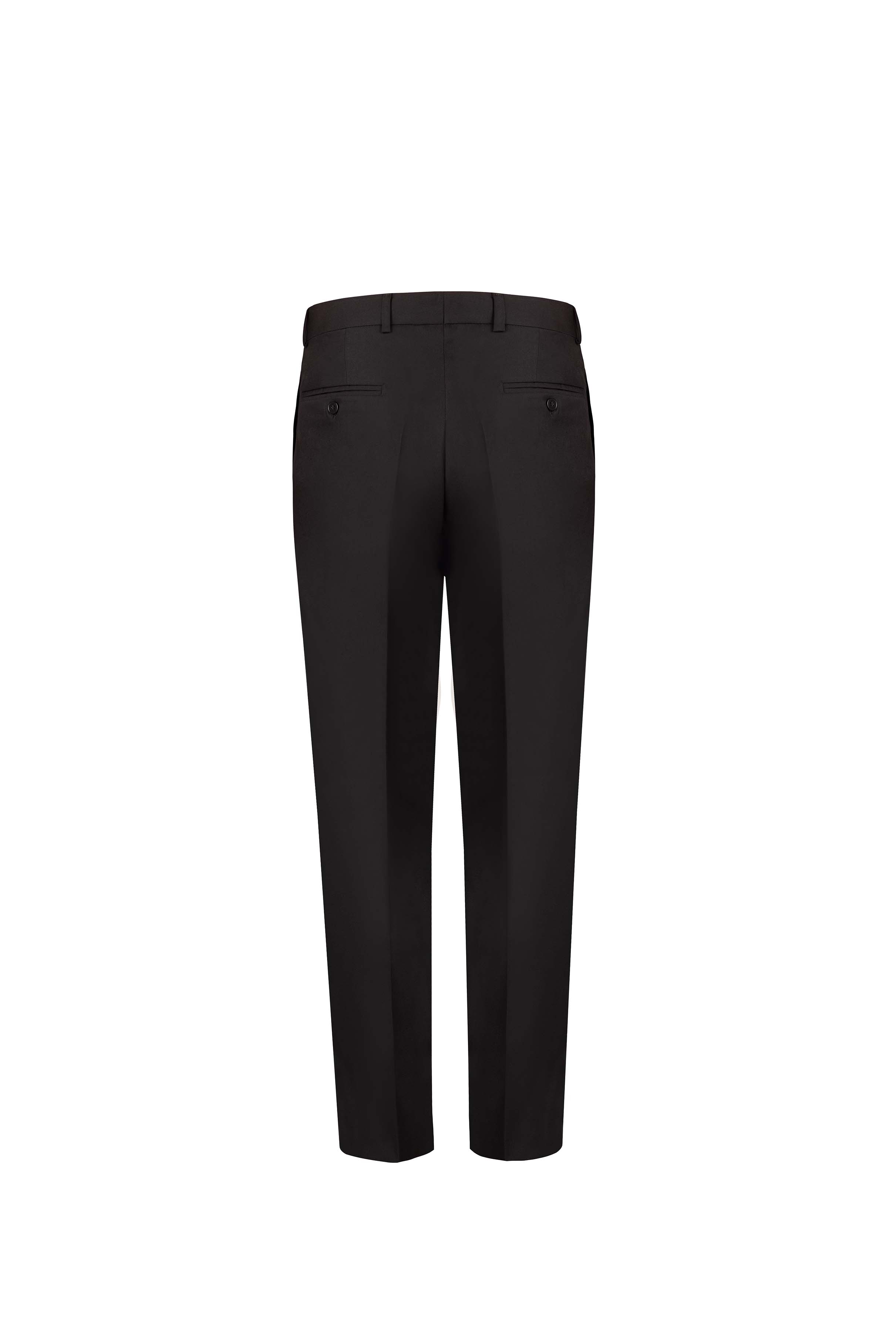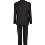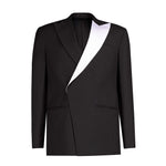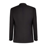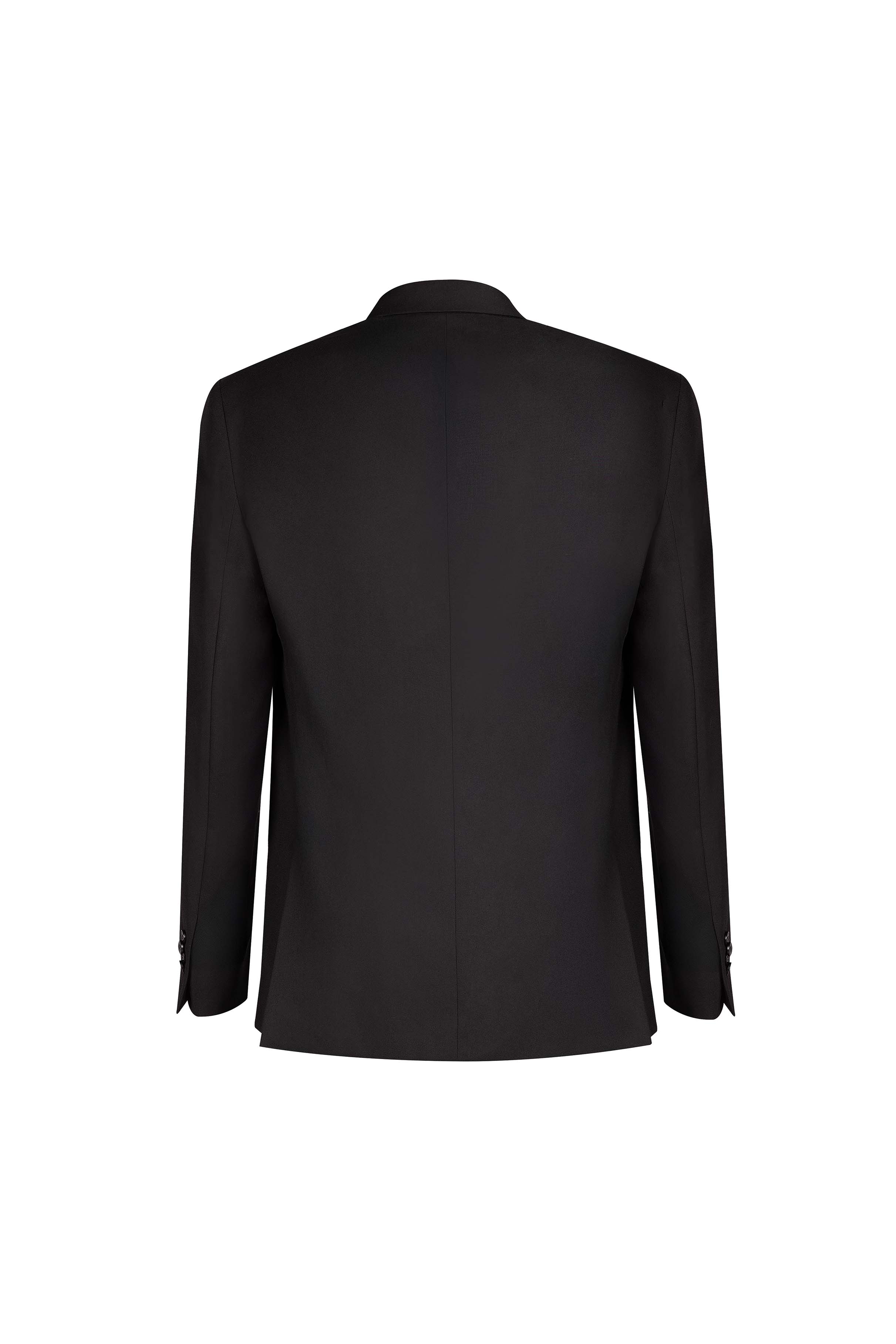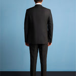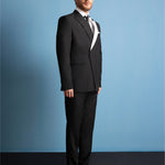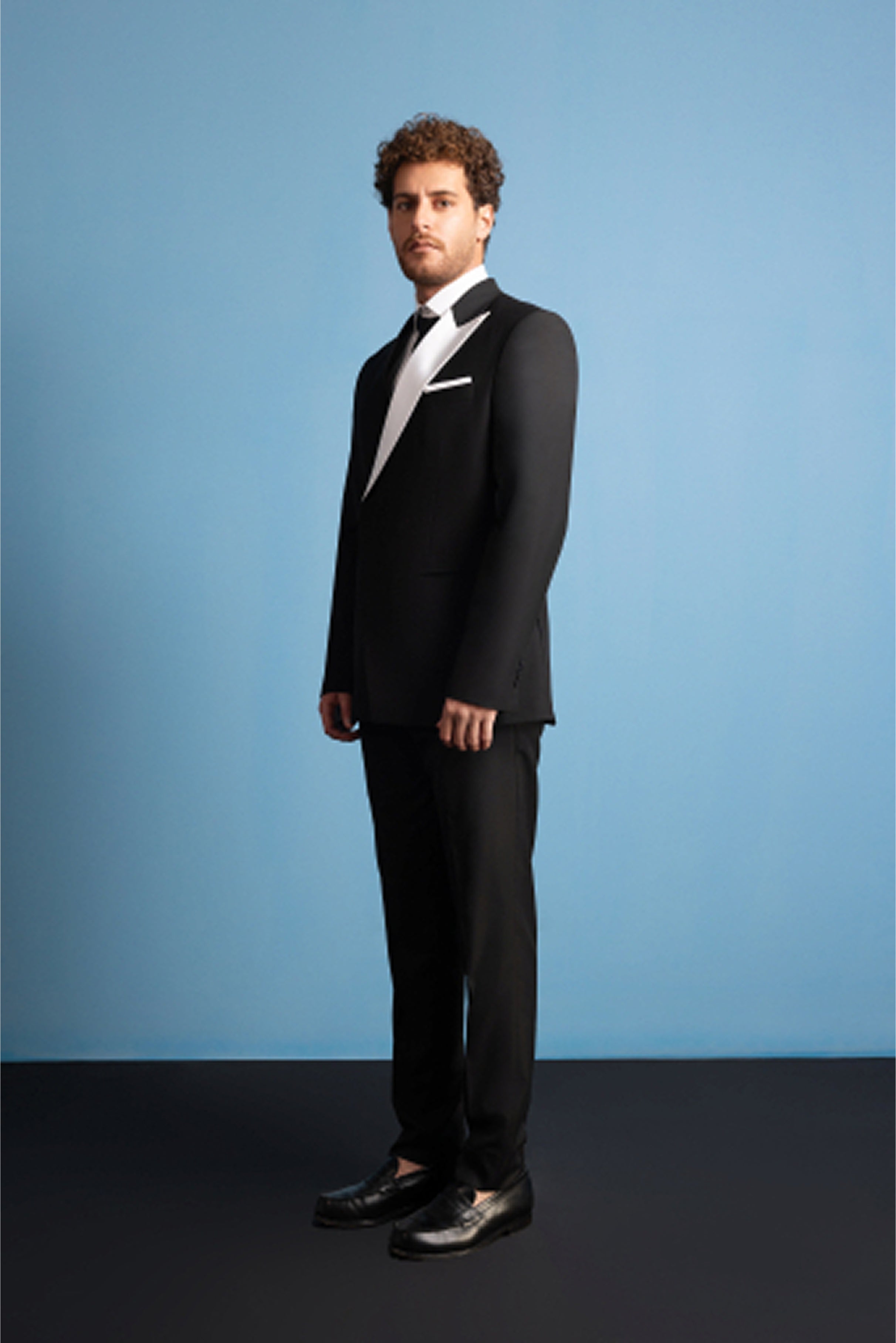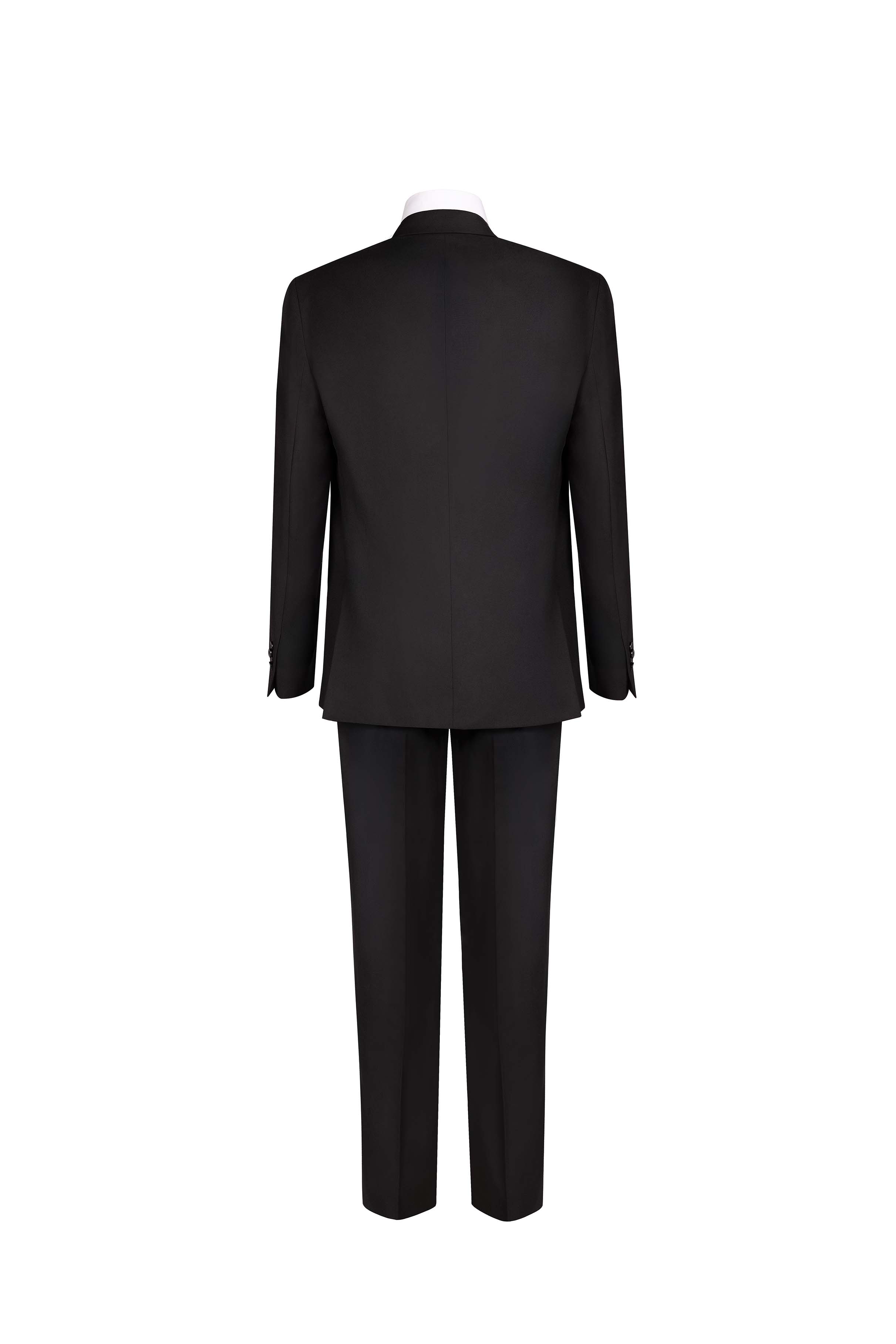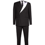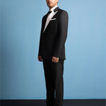 Slim fit tuxedo in black. White satin peak lapel collar. Long sleeves with buttoned cuffs. Welt pocket at the chest, piped pockets at the hip, and an inside pocket. Back vents. Hidden front button fastening. Matching trousers with front zip and button closure, side pockets, and welt pockets at the back.