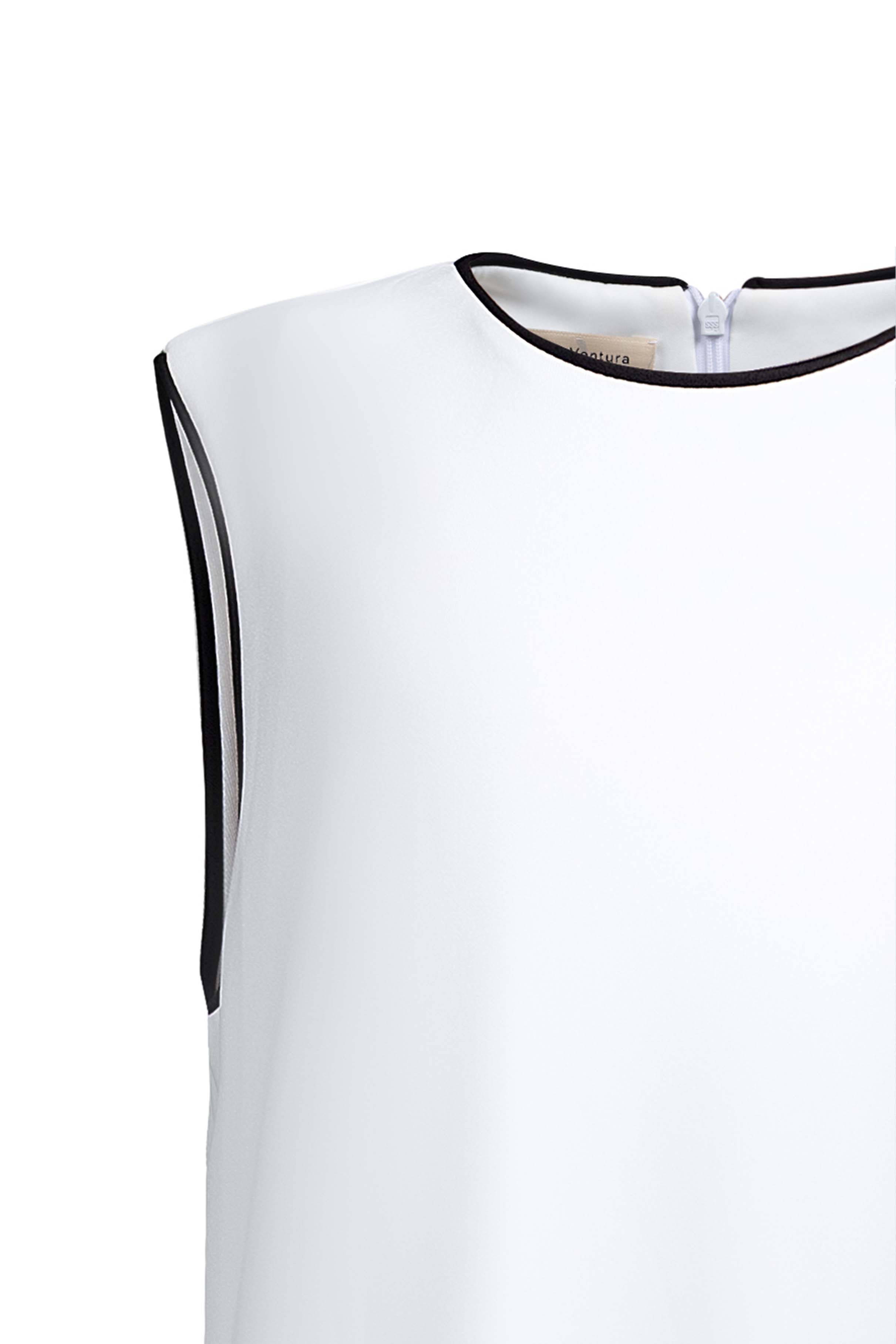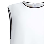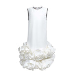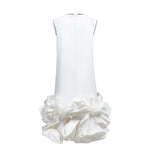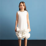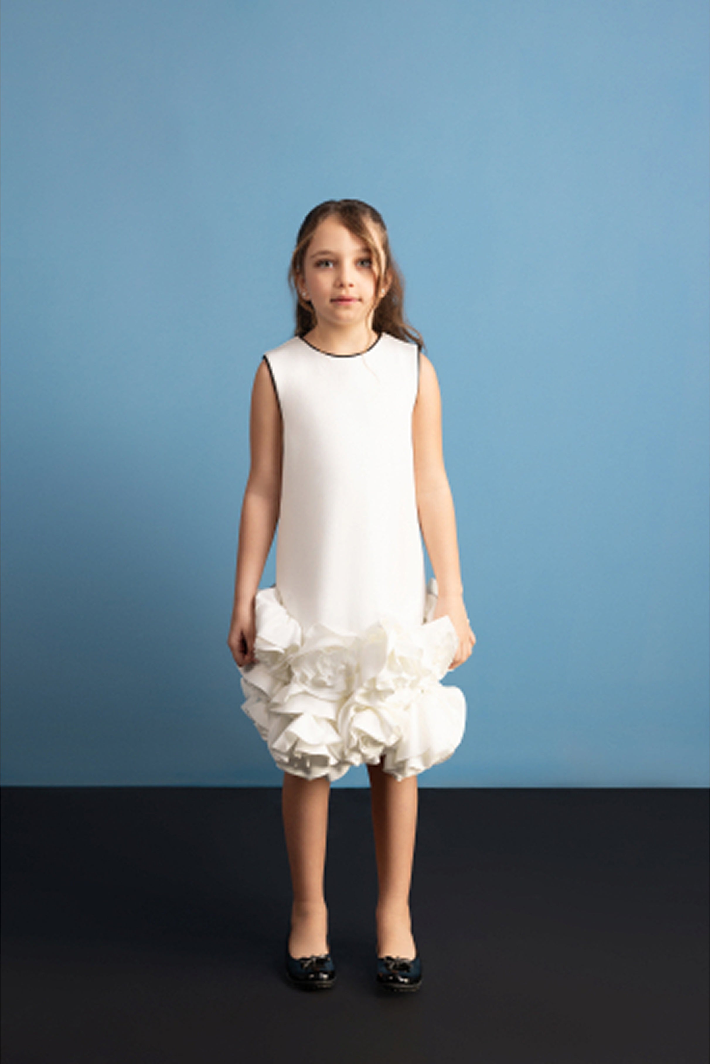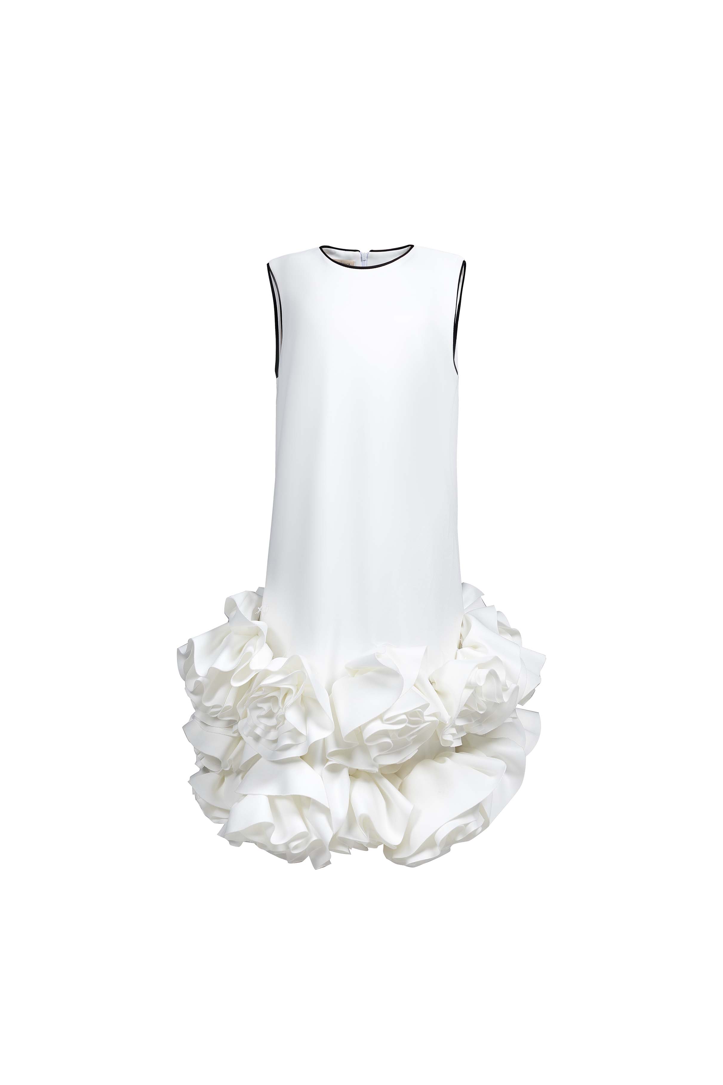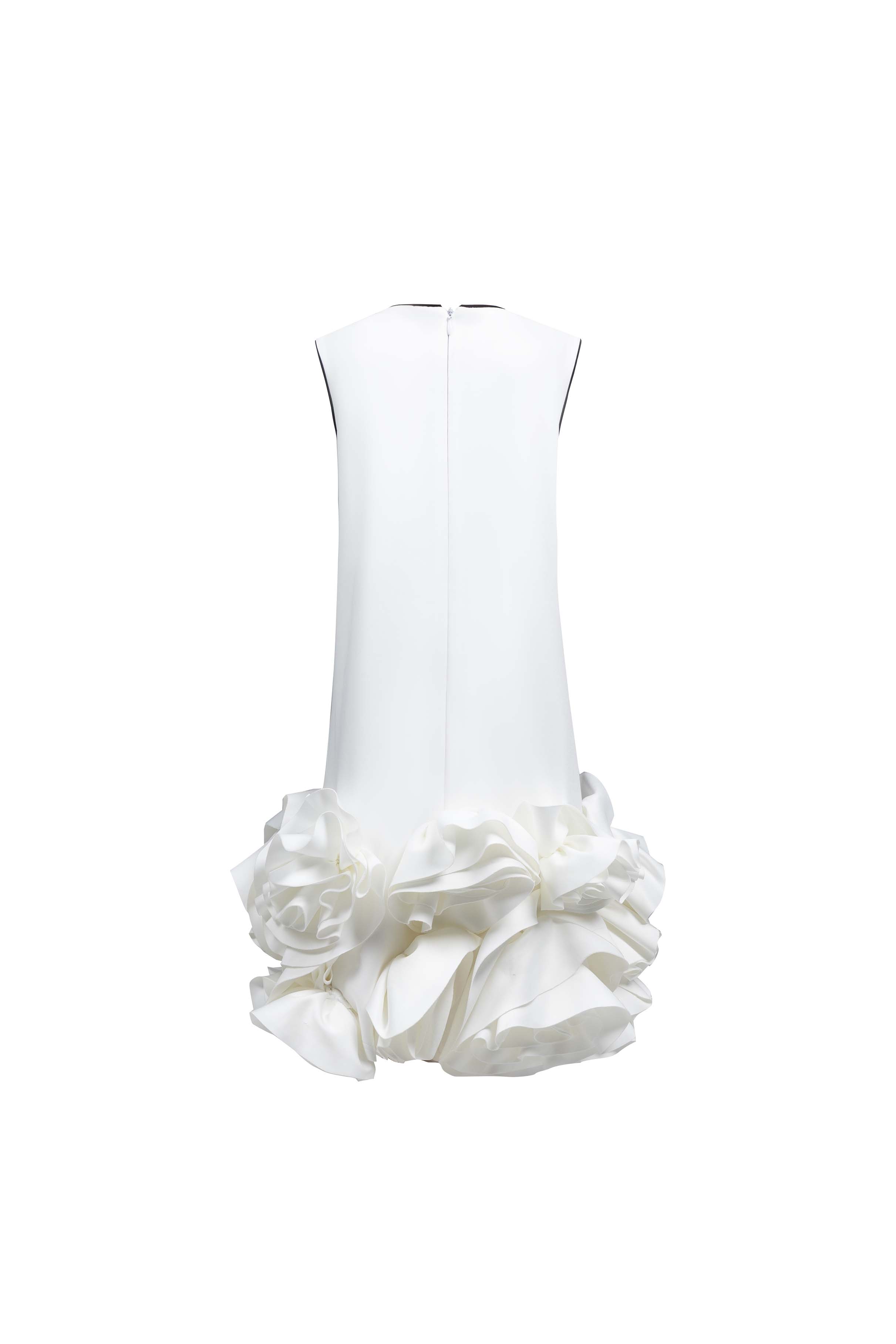 Sleeveless white dress featuring black contours on the collar and armholes and adorned with a handmade 3D bouquet of flowers at the hem.