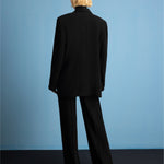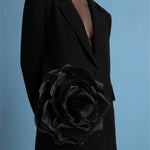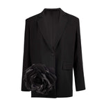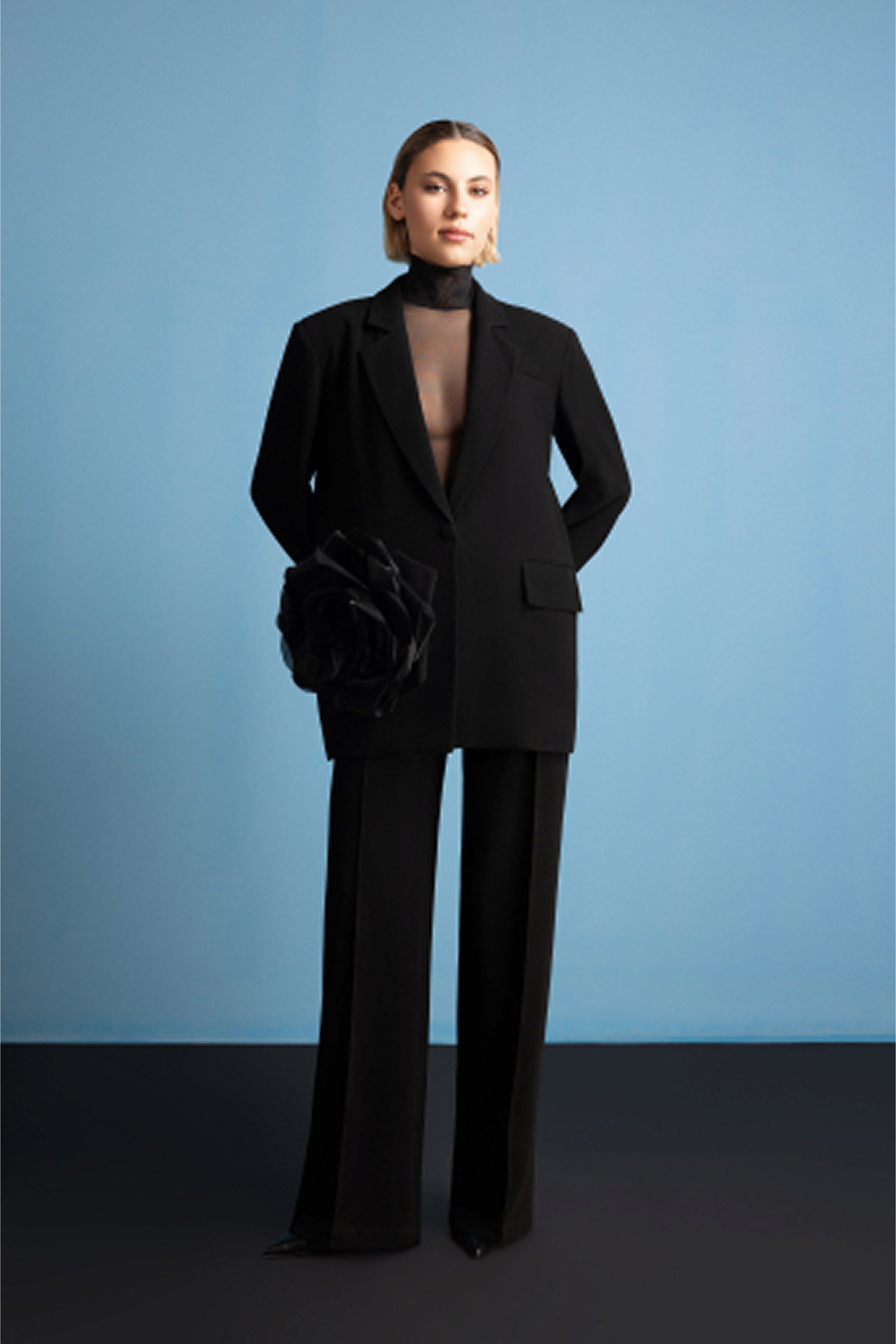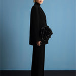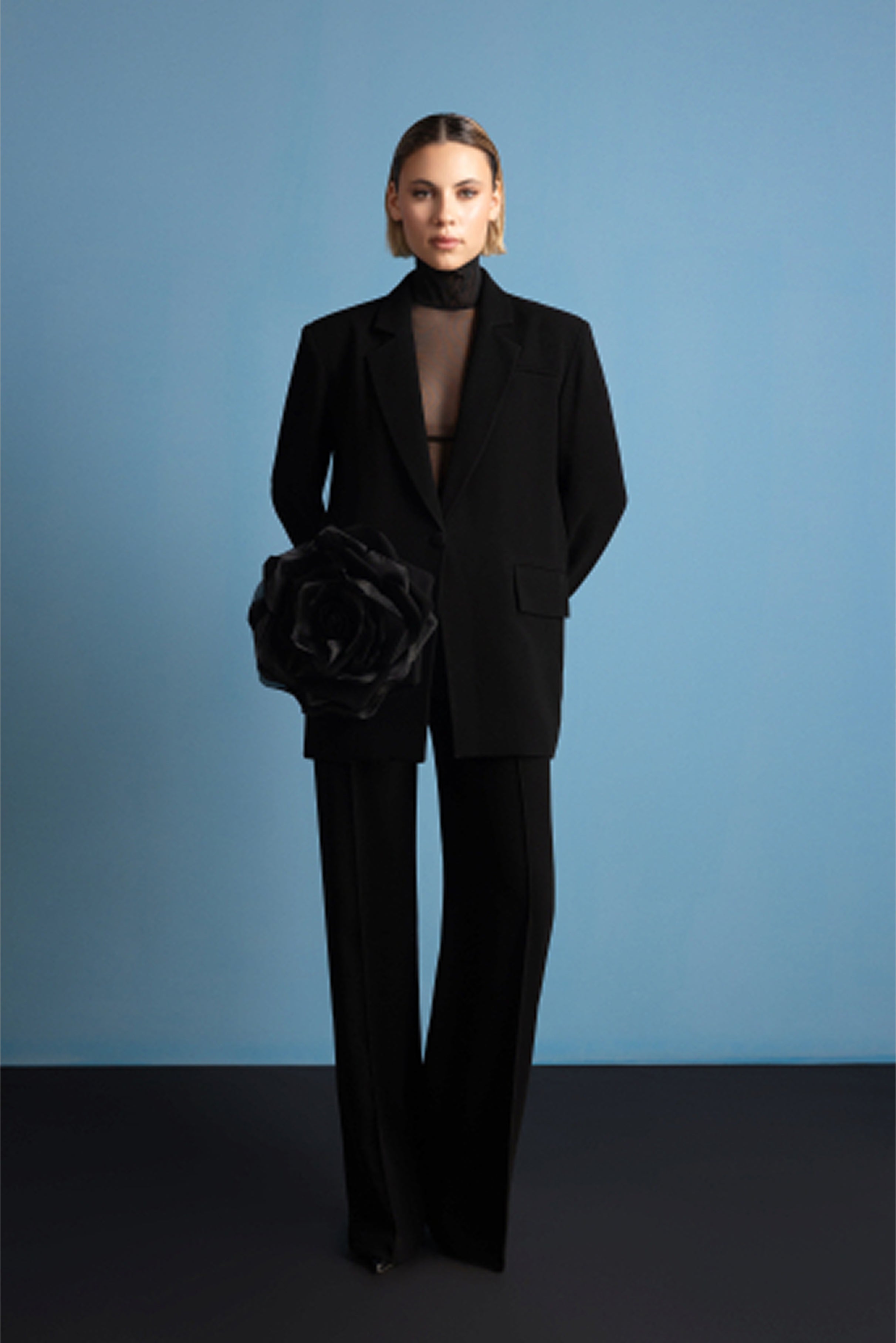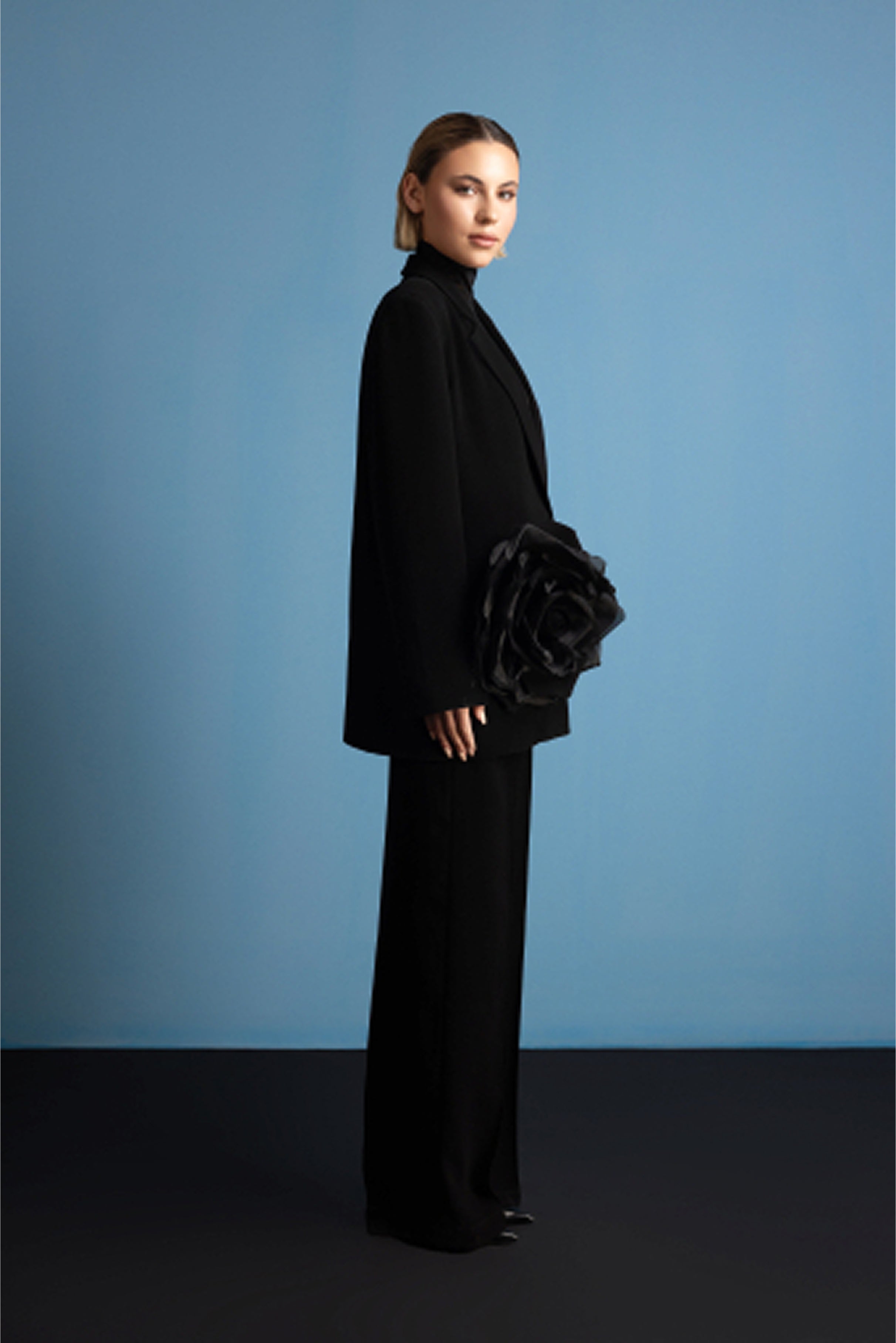 Tailored oversized suit, featuring an oversized structured jacket, with a removable 3D crepe and organza flower, paired with wide-leg trousers.