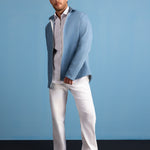 Structured blue denim jacket with silver zipper. Tailored fit with clean lines.