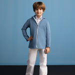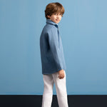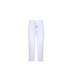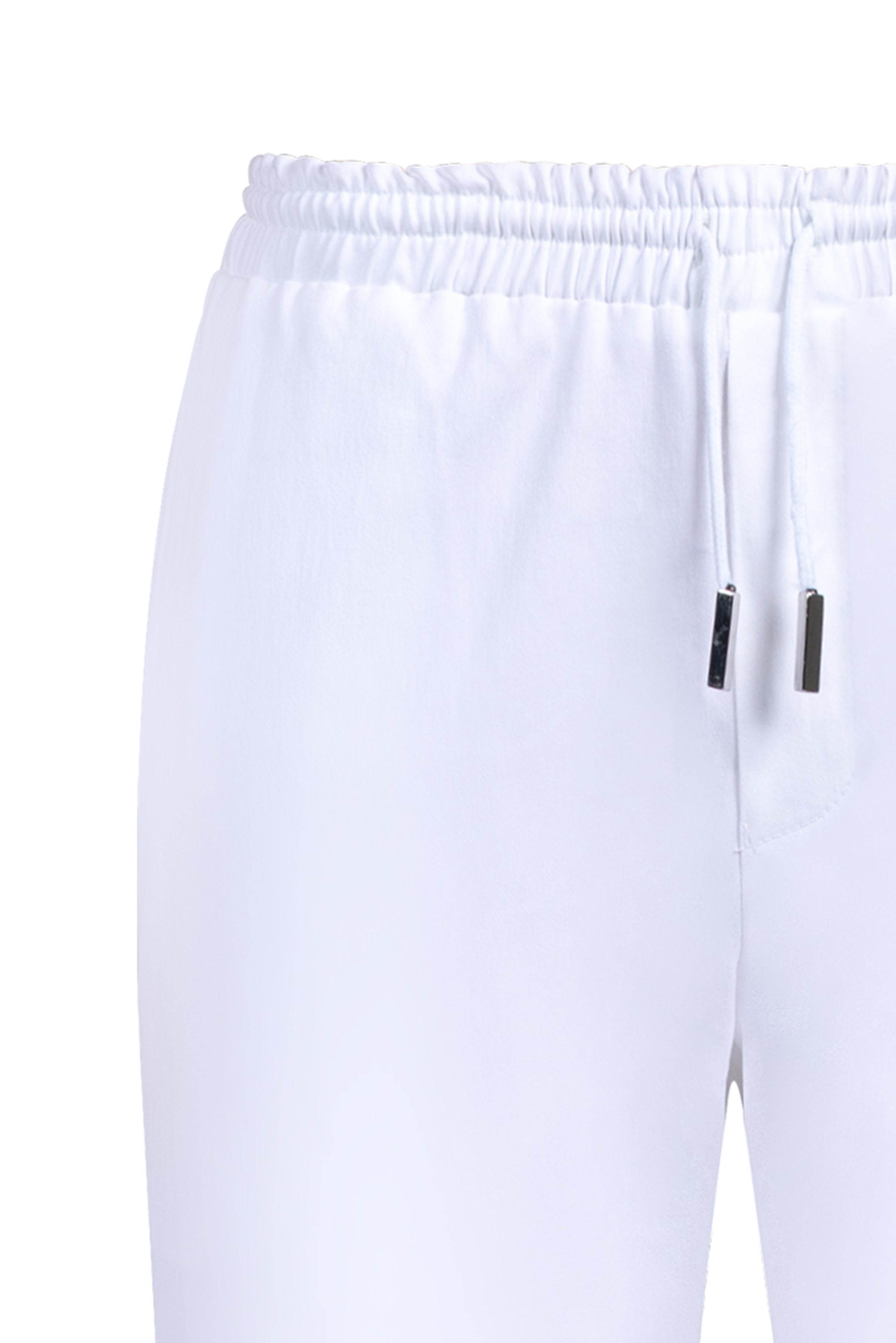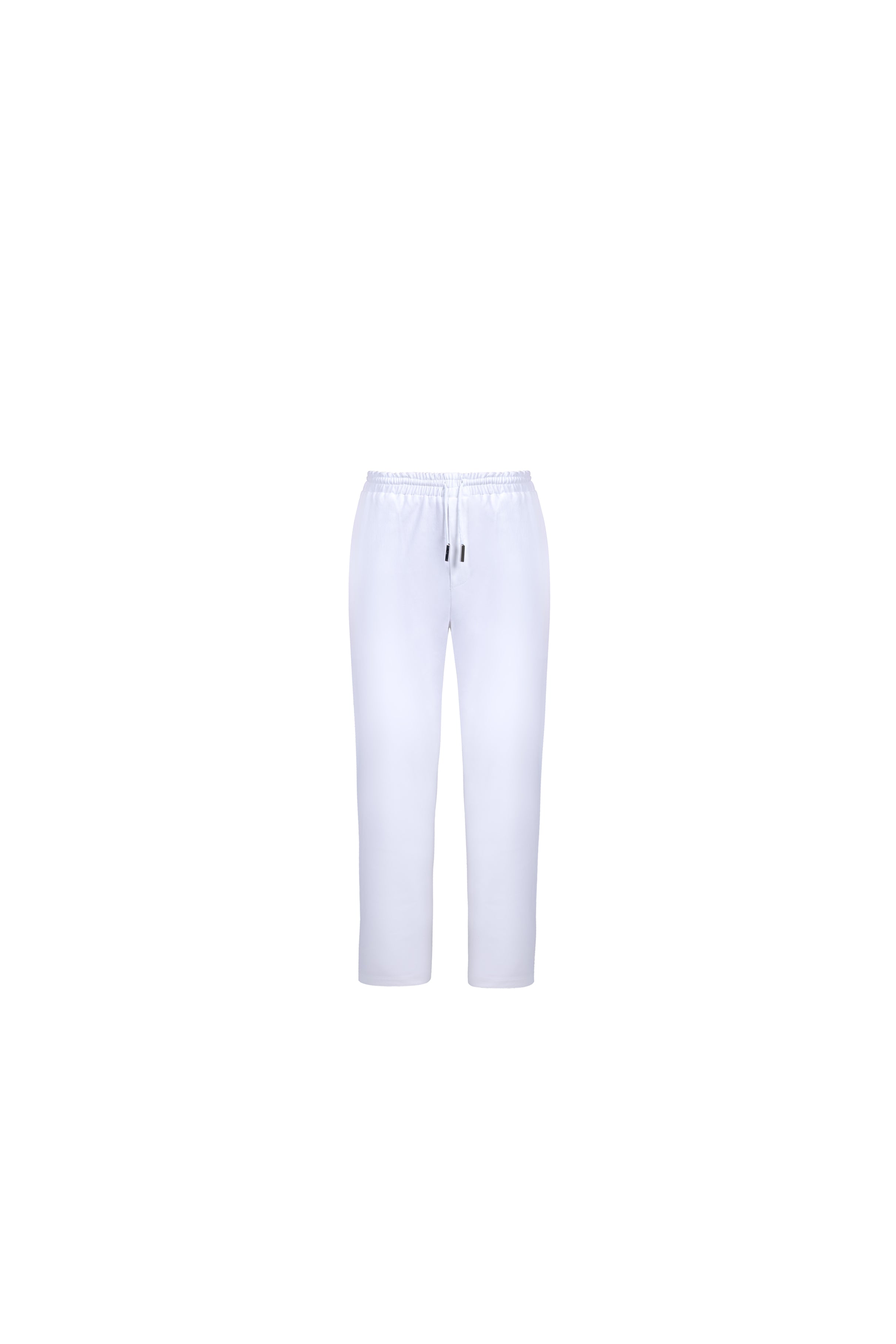 White denim pants with elastic waist and silver-tipped tie. Relaxed fit, minimal detailing.