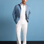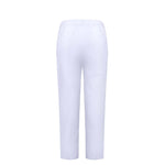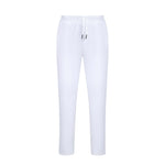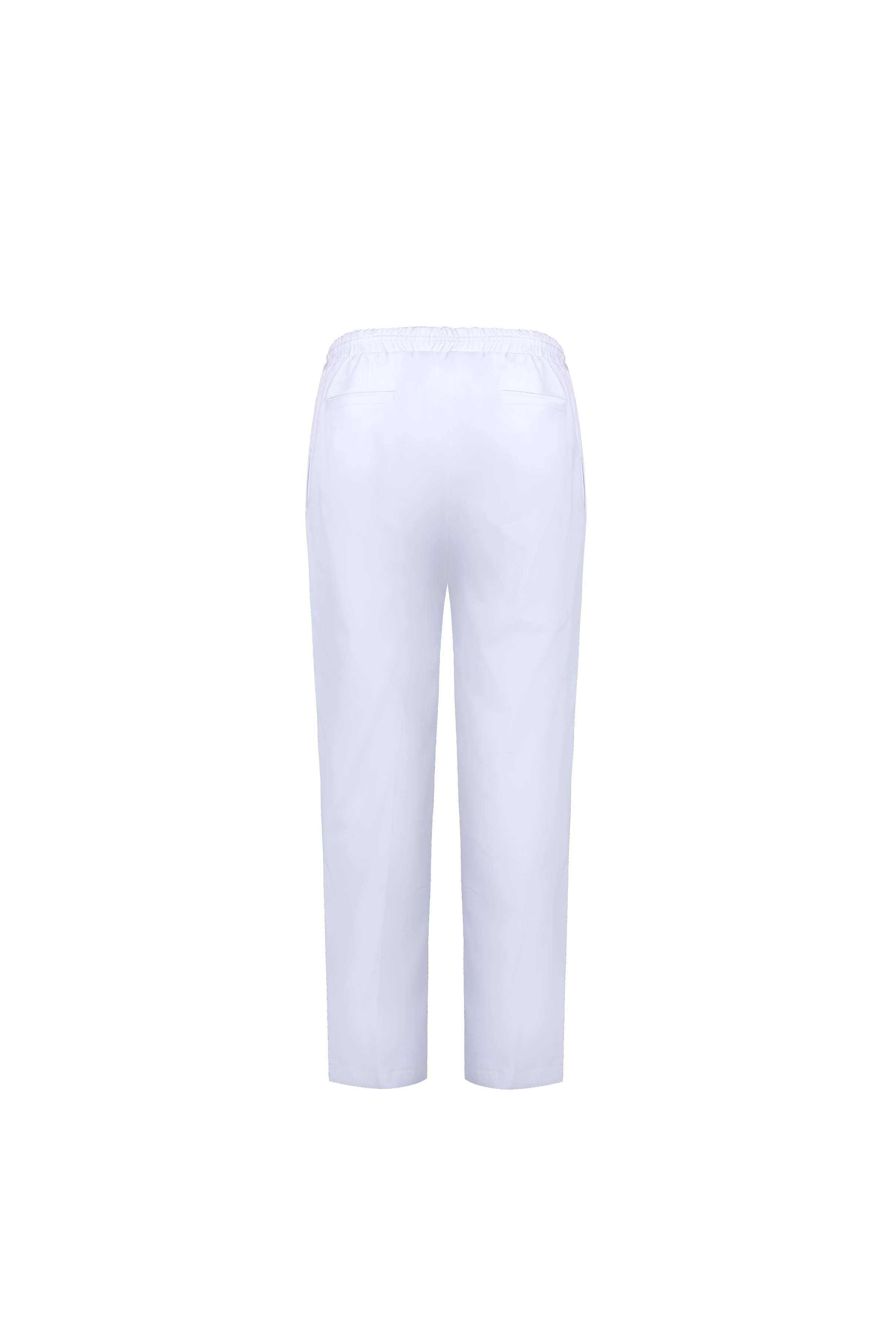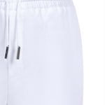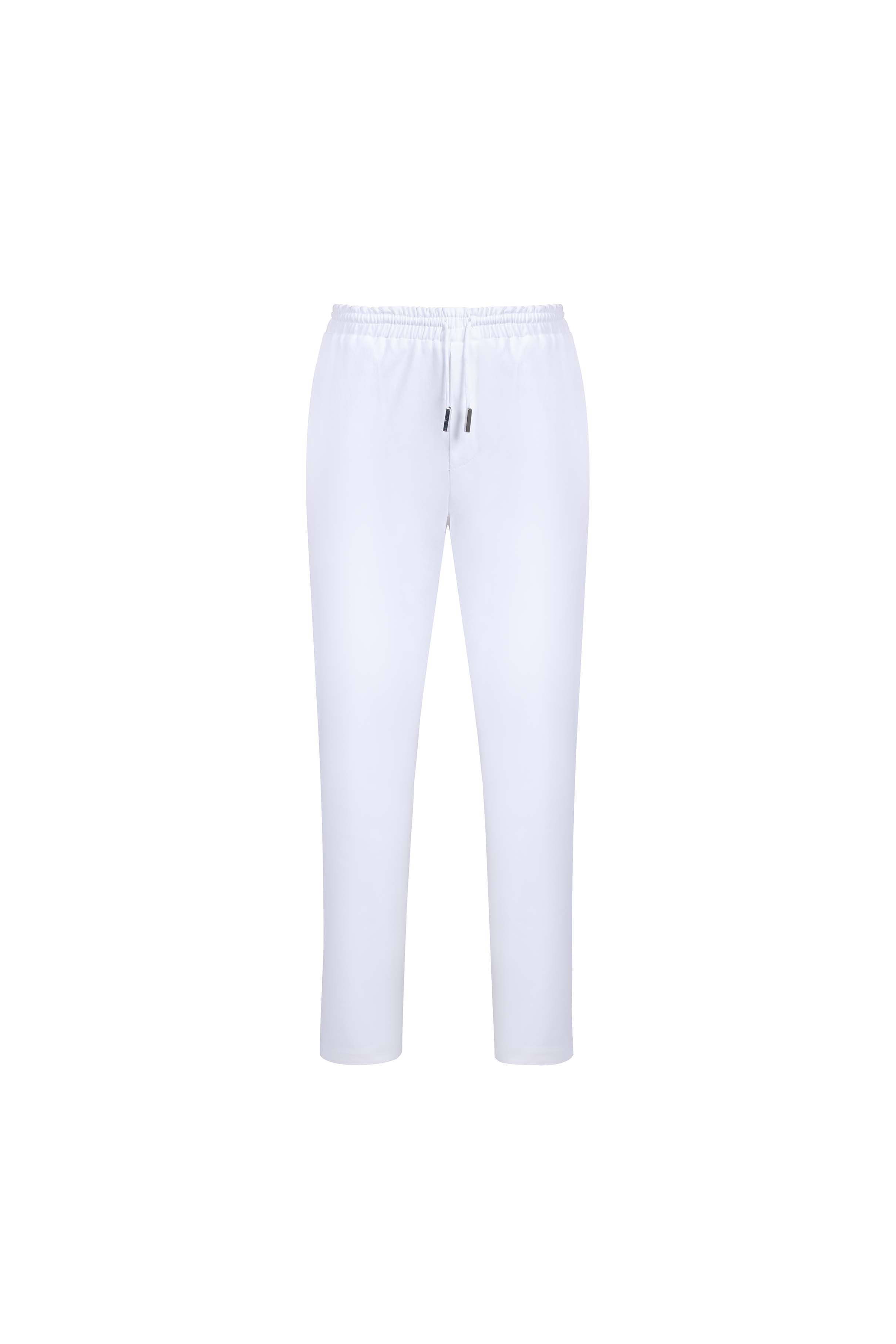 White denim pants with elastic waist and silver-tipped tie. Relaxed fit, minimal detailing.