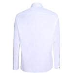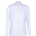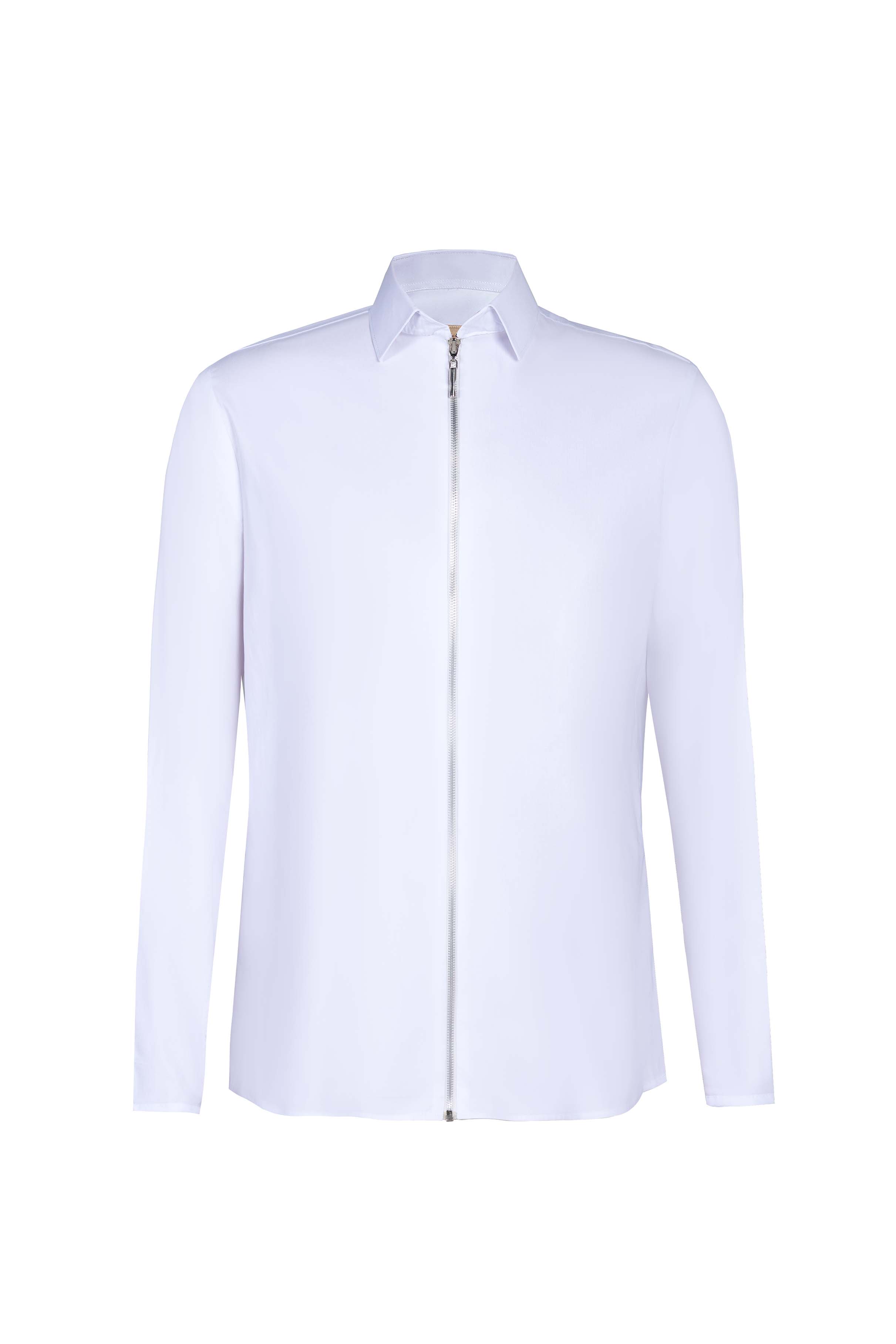 White denim shirt with silver front zipper. Crisp finish, straight silhouette.