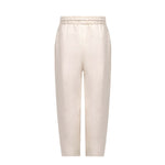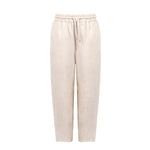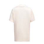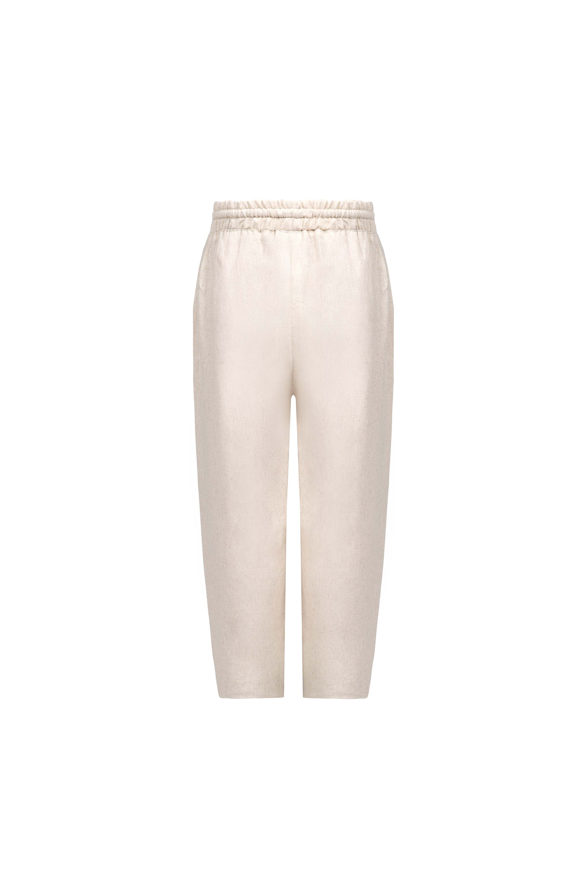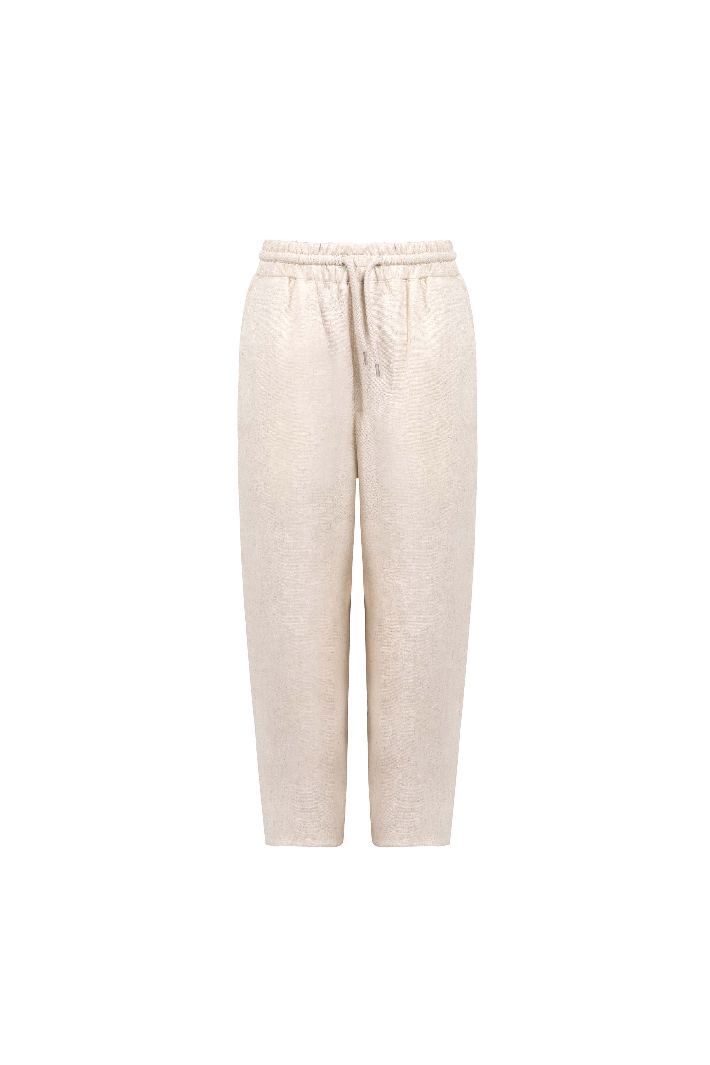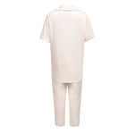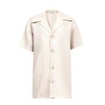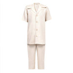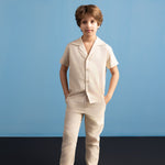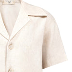 Two-piece linen set in beige. Includes a short-sleeved shirt with front button placket and tonal buttons. Matching straight-leg trousers with adjustable tie waist.