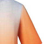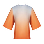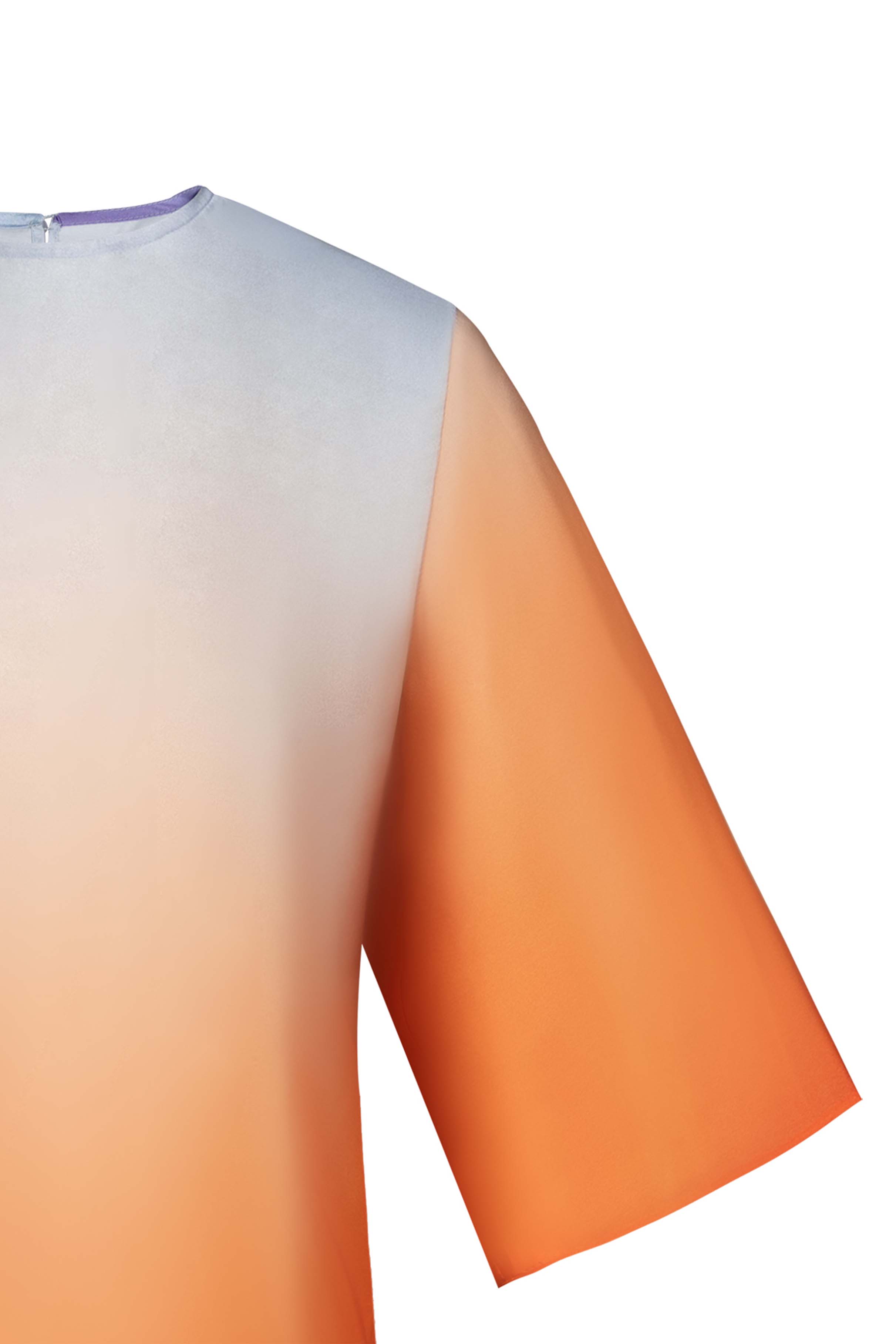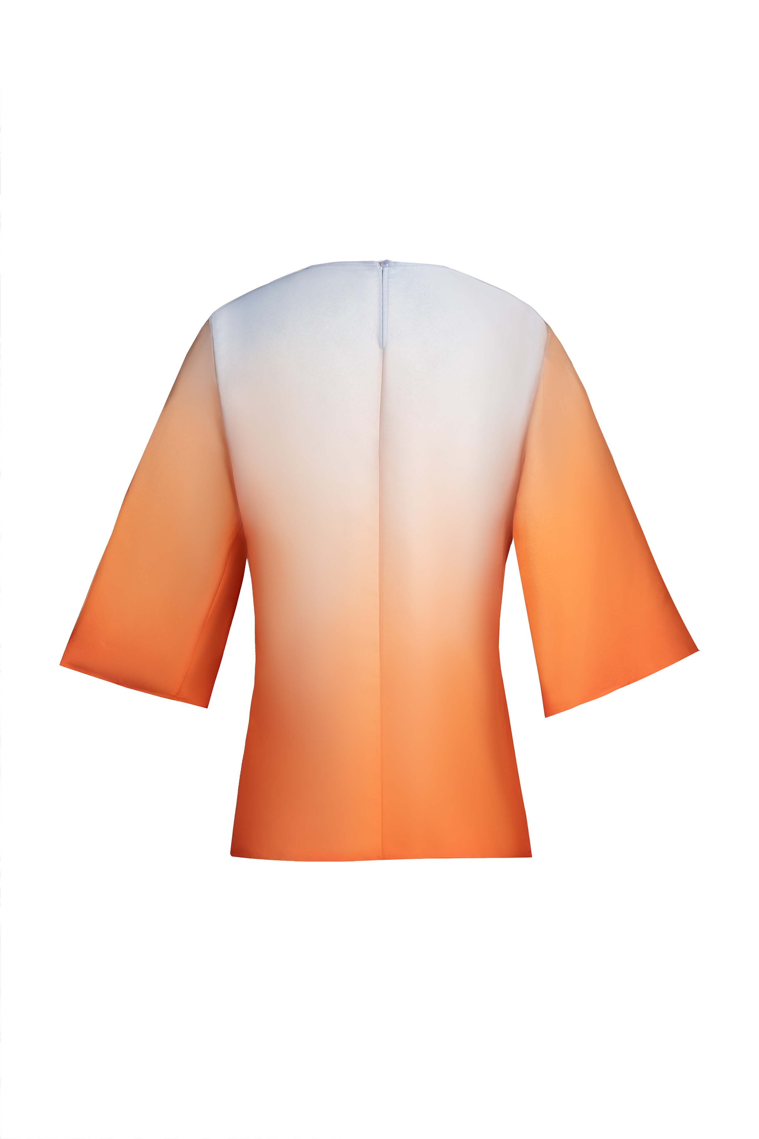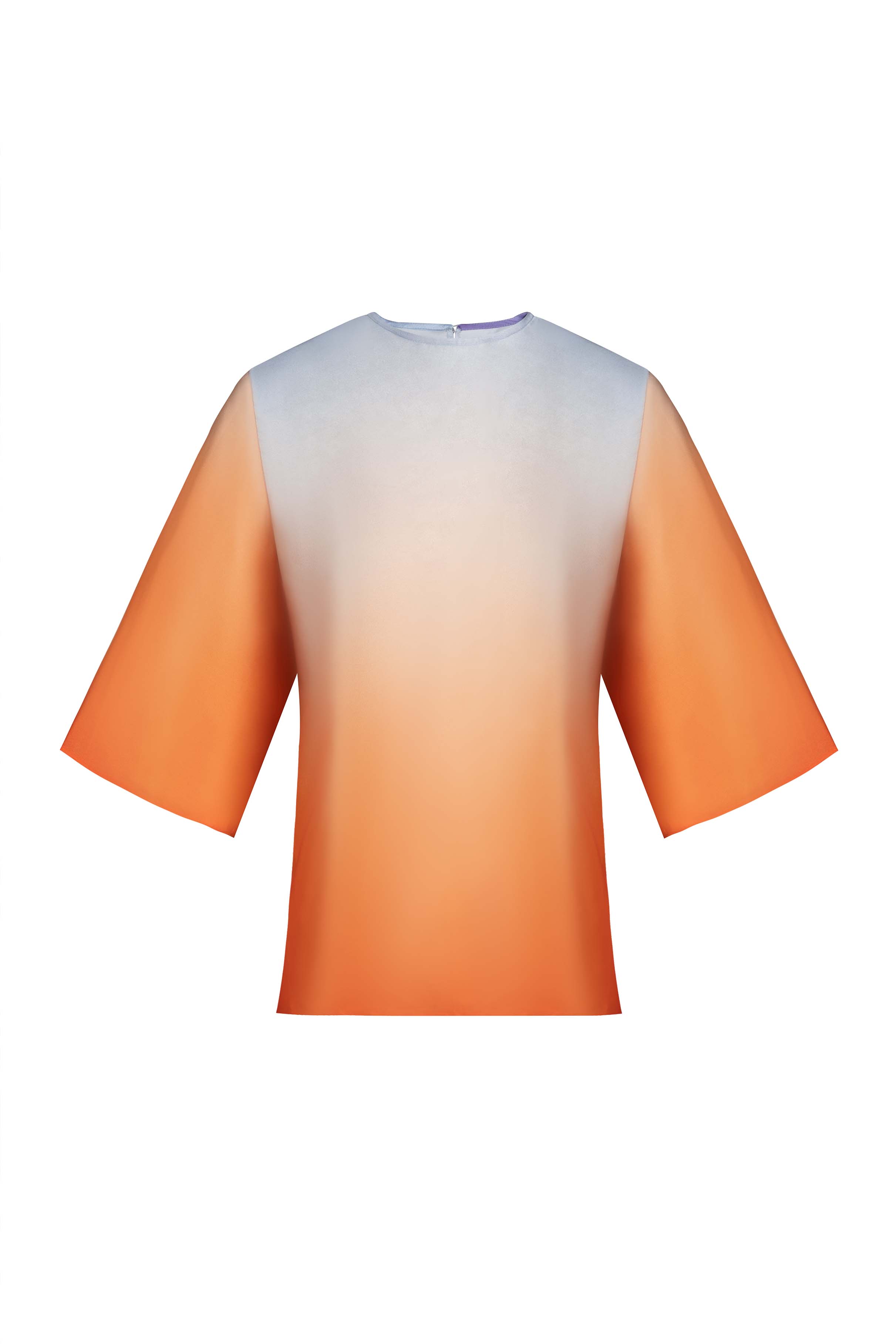 Ombre satin shirt with structured padded shoulders. Features a color gradient and straight silhouette.