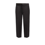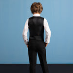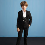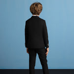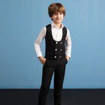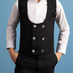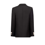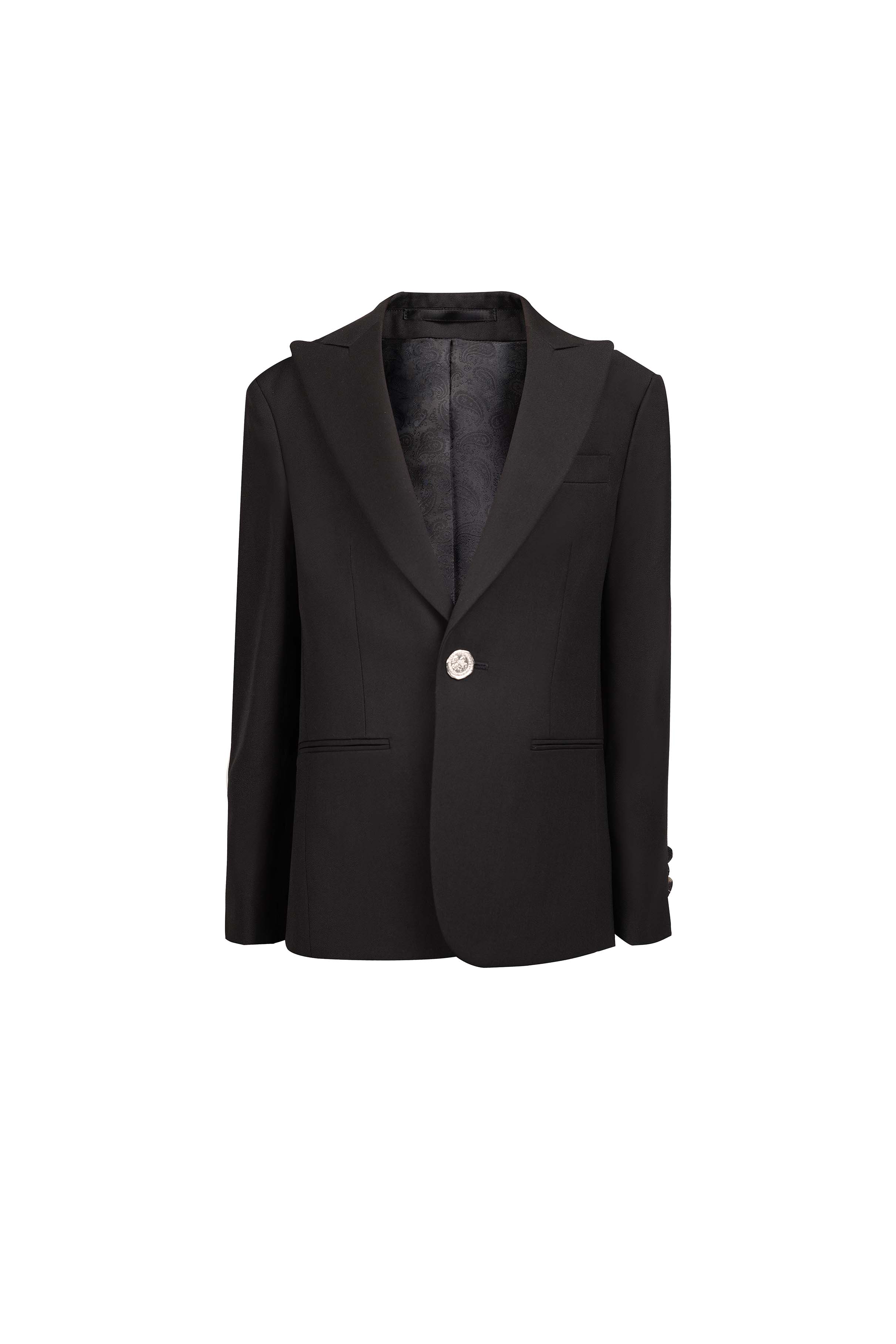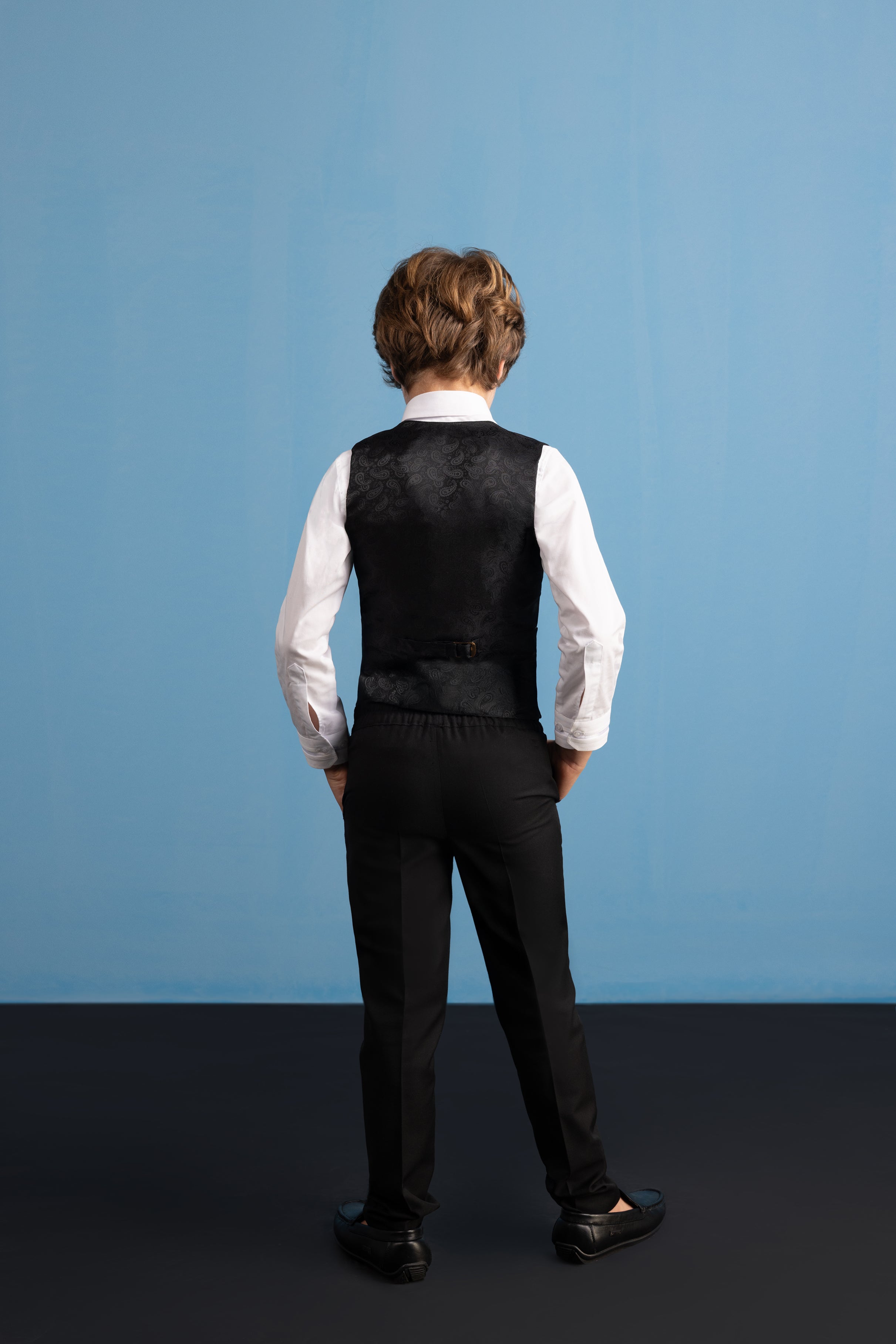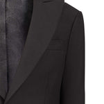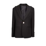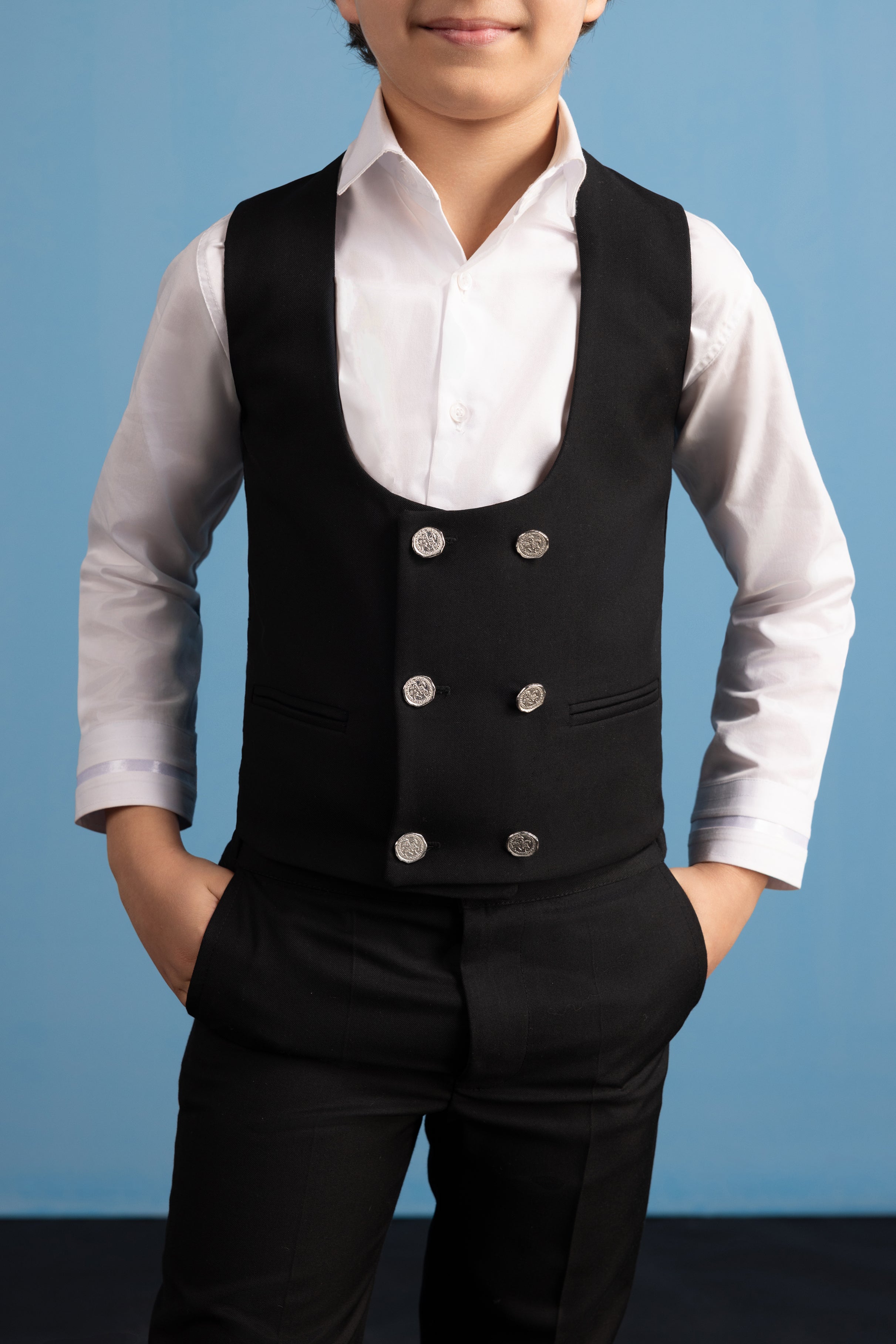 Slim fit blazer in lightweight summer fabric. Notched lapel collar. Long sleeves with buttoned cuffs. Welt pocket at the chest, pockets at the hip, and an inside pocket. Back vents. Front button fastening. Matching trousers with front zip and hook closure, side pockets, and welt pockets at the back. Wide-cut gilet with metallic buttons and scoop neckline.