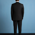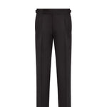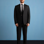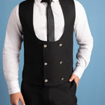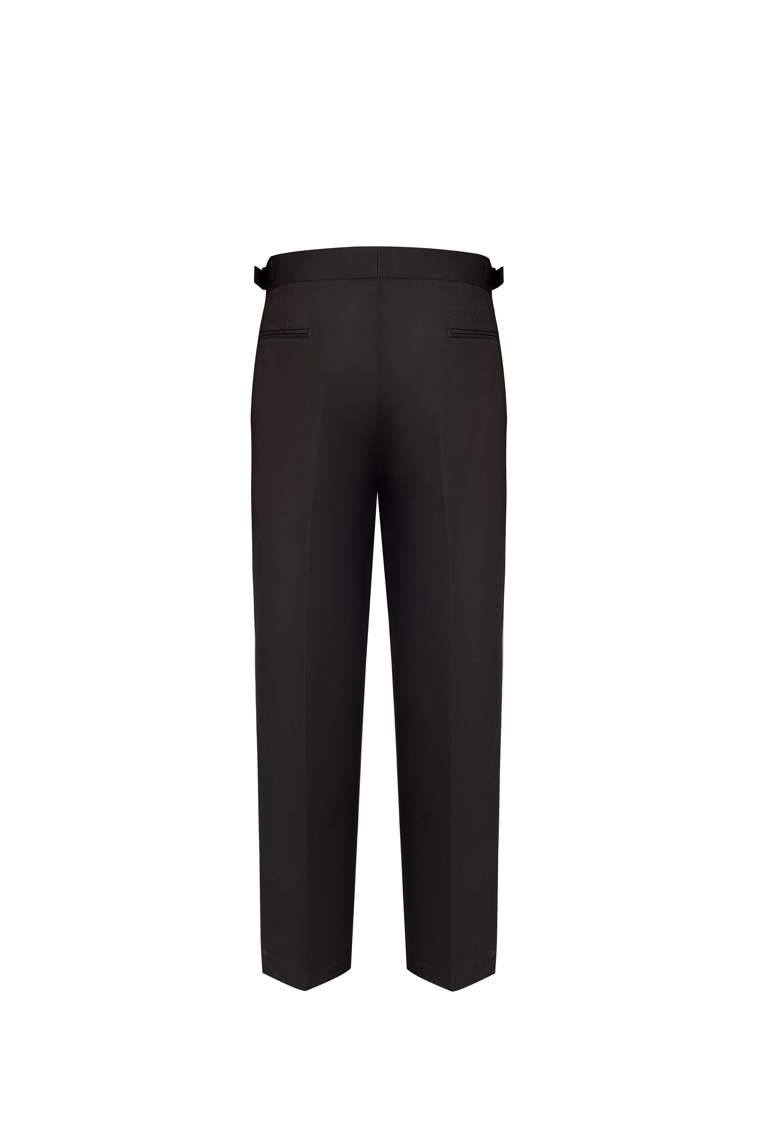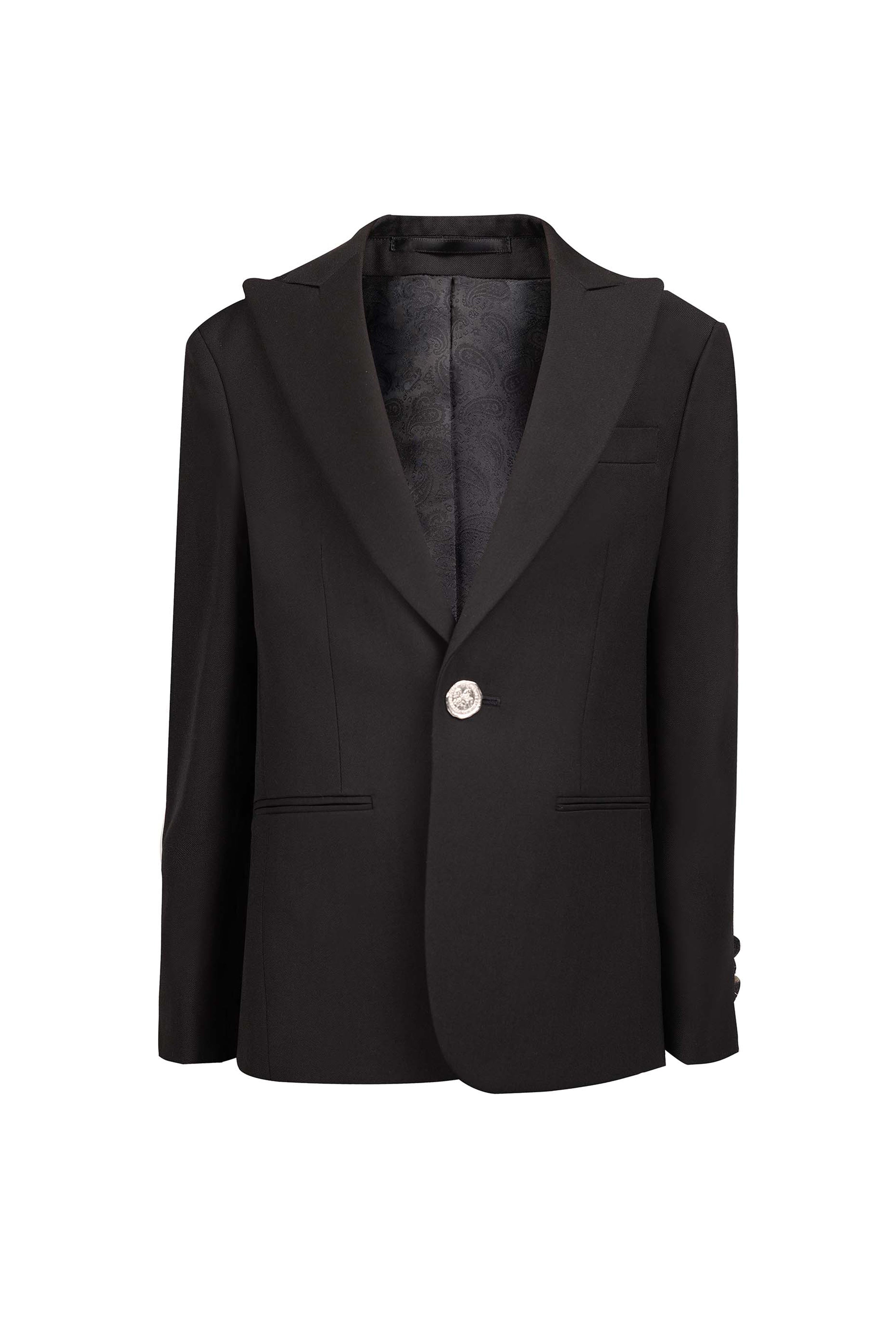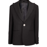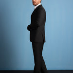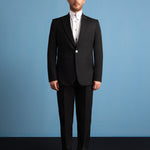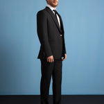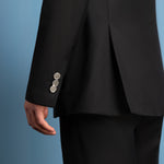 Slim fit blazer in lightweight summer fabric. Notched lapel collar. Long sleeves with buttoned cuffs. Welt pocket at the chest, pockets at the hip, and an inside pocket. Back vents. Front button fastening. Matching trousers with front zip and hook closure, side pockets, and welt pockets at the back. Wide-cut gilet with metallic buttons and scoop neckline.