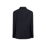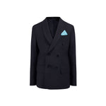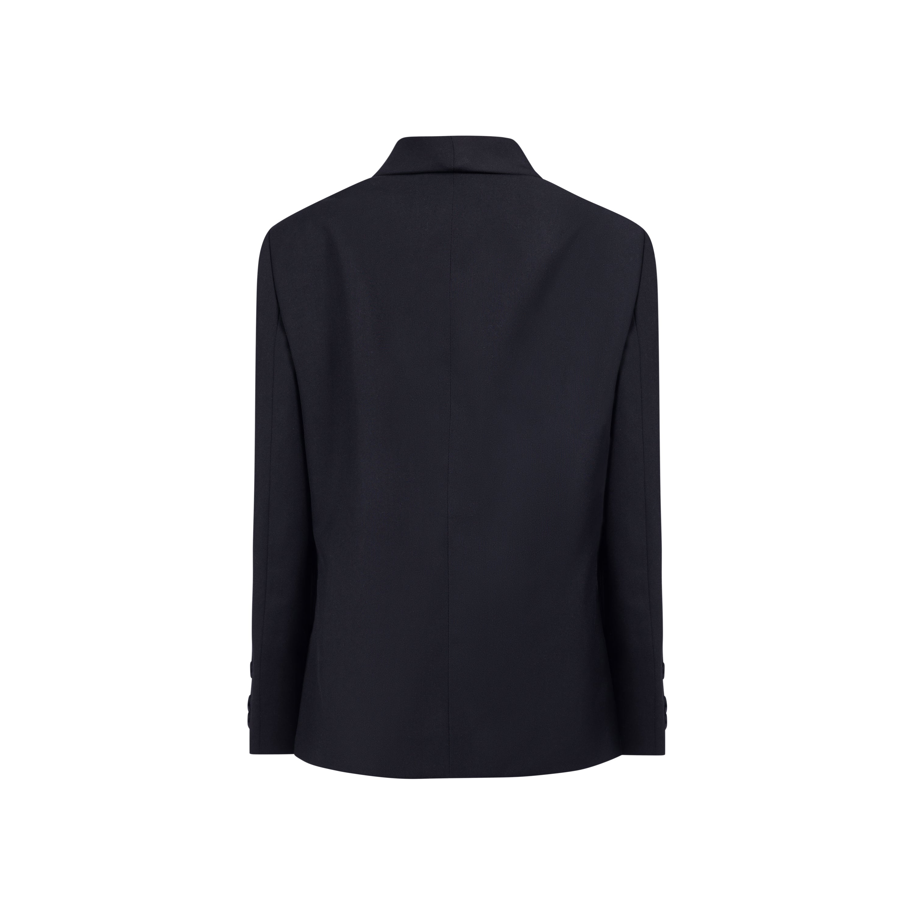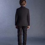 This double-breasted shawl collar jacket features VV signature detailing on the sleeves and chest, with two waist pockets and one chest welt pocket. The removable blue detail allows for versatile styling, offering the option to wear it as a classic plain black suit or with the blue accent to match the rest of the family.
