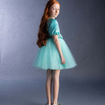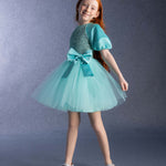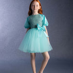 This enchanting dress showcases a sparkly bodice with short puffed sleeves, complemented by a voluminous tulle skirt. A charming bow at the waist adds the perfect finishing touch to this whimsical and elegant design.