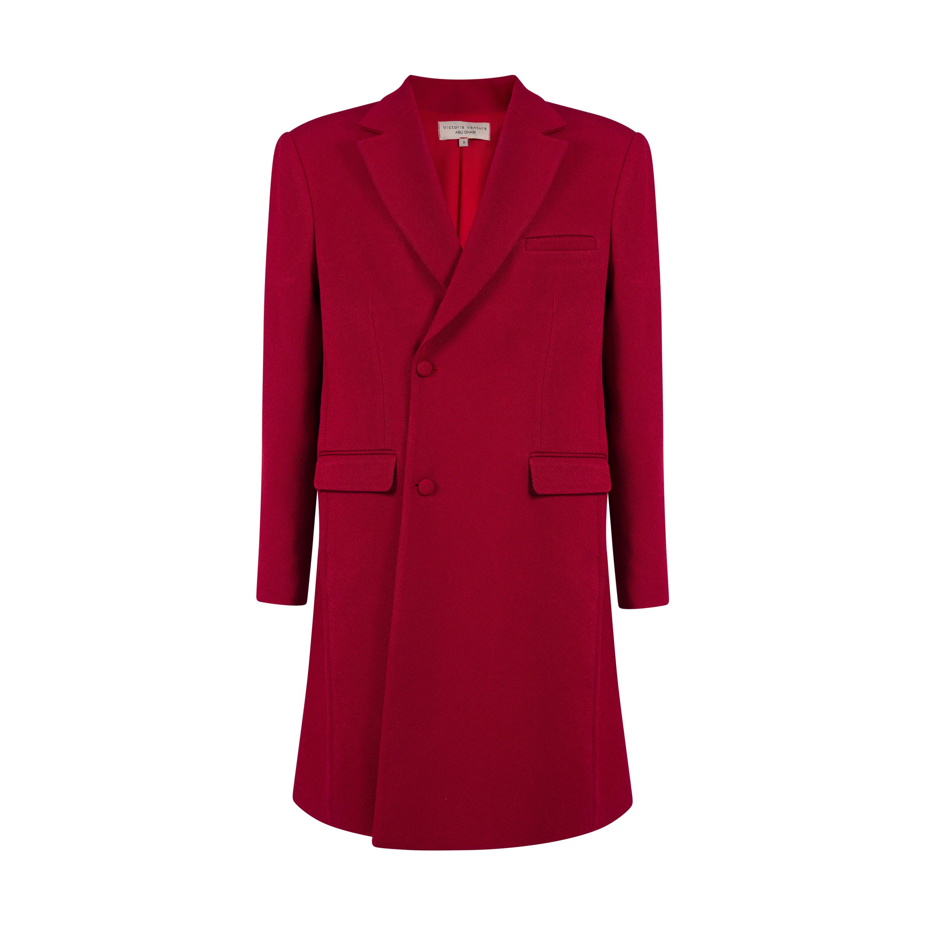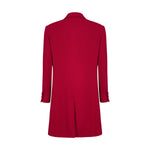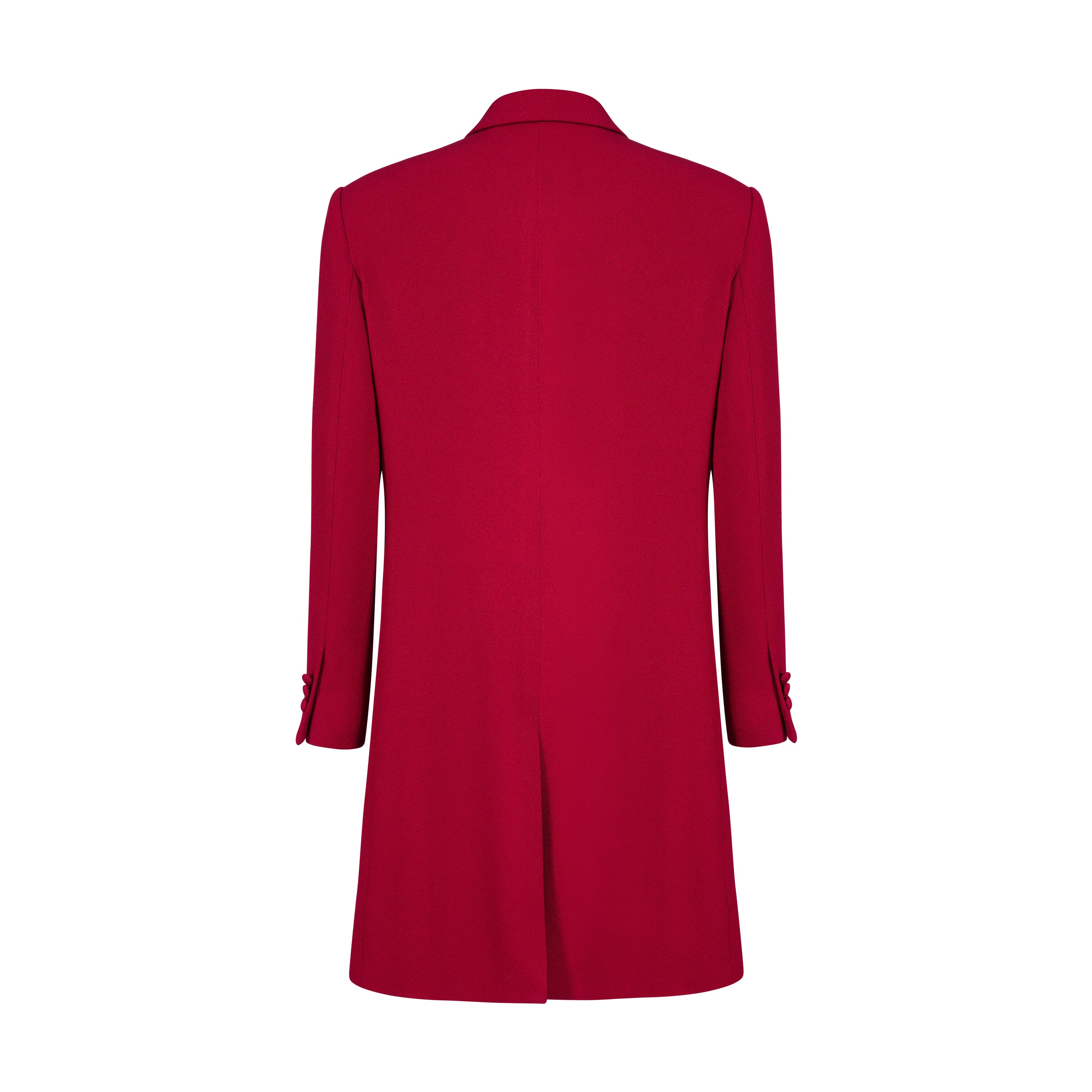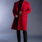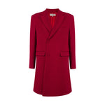 A red ankle-length wool blend coat with structured shoulders, offering a bold and elegant silhouette. The rich color and tailored design provide both warmth and sophistication, making it a statement piece for any wardrobe.