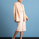 Oversized salmon sequin blazer with padded shoulders. Fish-scale texture, strong silhouette.