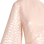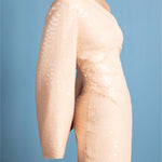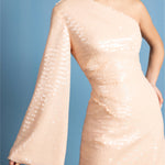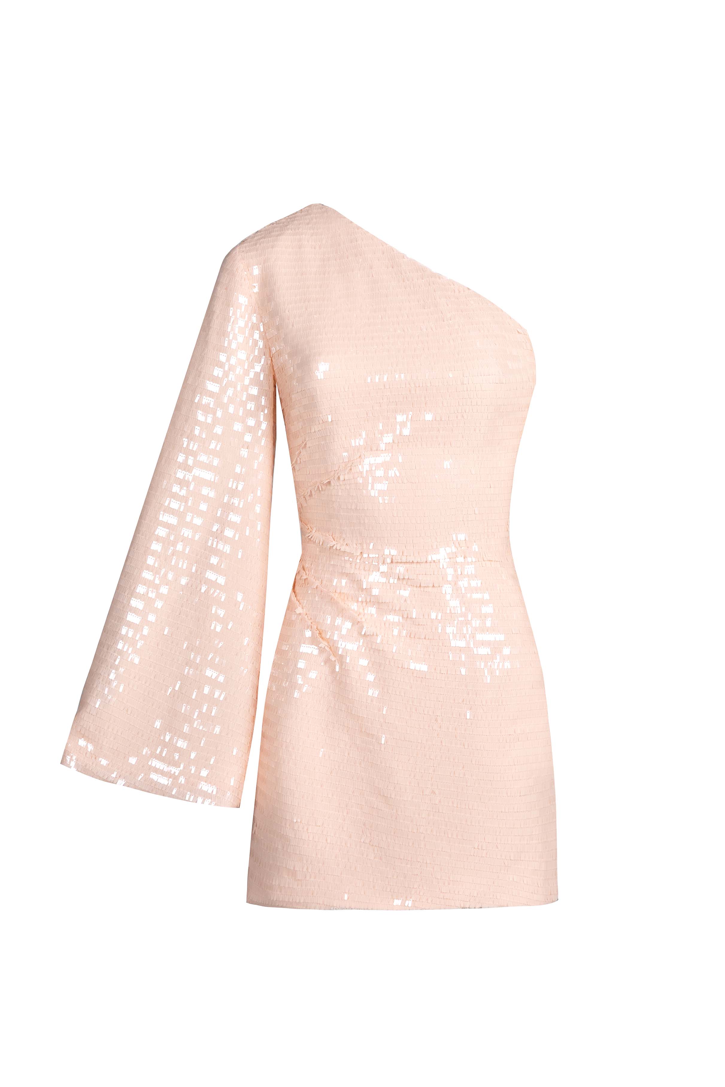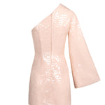 One-shoulder sequin dress in salmon pink with single long sleeve. Draped waist, fitted silhouette.